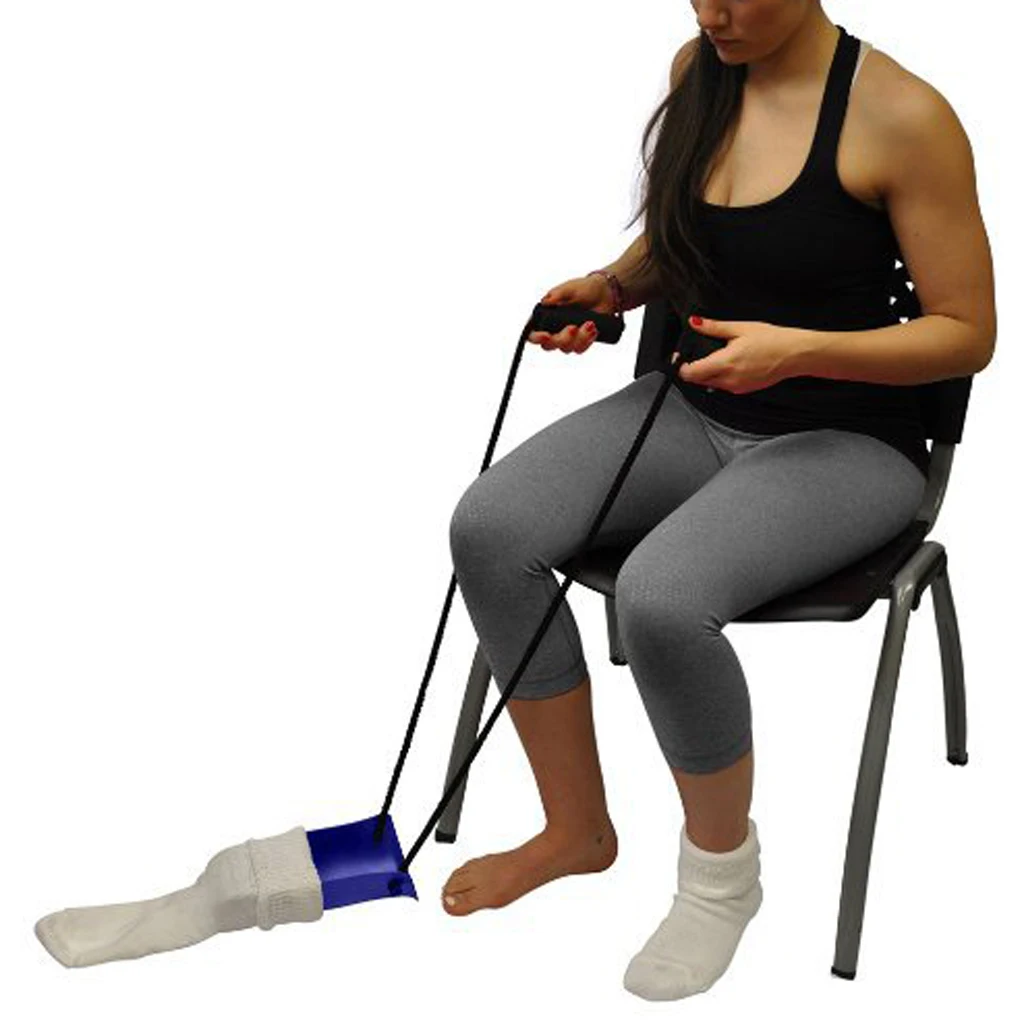 -Уменьшает вероятность травмирования спины, позвоночника или рук из-за внезапного растягивания или дергающегося движения, надевая носки.