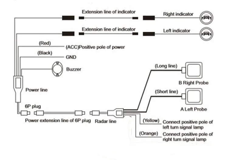 * Установите датчик радара на заднюю часть автомобиля после снятия заднего бампера. * Замените Оригинальное автомобильное боковое зеркало, Подключите светодиодный провод к радарной системе. * Подключите провод рядом со стеклом к индикаторному светильник с положительным электродом для управления зуммером. * Подключите провод питания к автомобильному ACC положительному электроду. И Подключите отрицательный электрод к отрицательному электроду батареи.