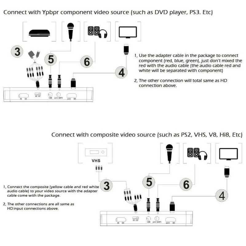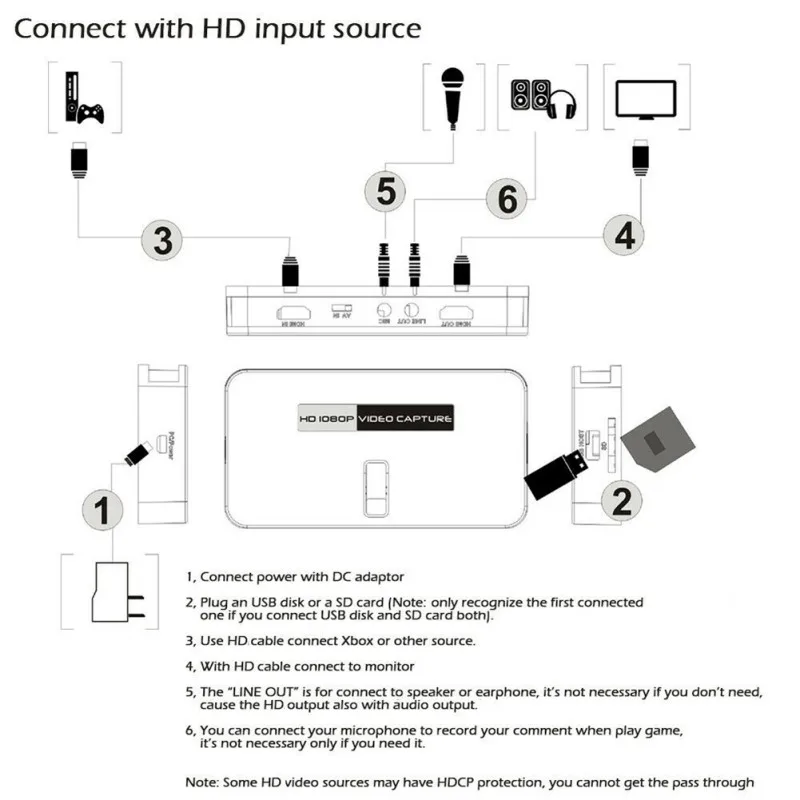Features: 1. Plug and play, no driver or computer required, one-click recording; full of practicability and convenience. 2. Support SD/HD video signals, up to 1080P resolution, 3.5mm audio port, equipped with HDMI/ color difference component/ composite video CVBS port and wire. (HDMI, Component Video, Composite Video) 3. Professional video software lets you can edit and upload videos easily; microphone adopted to record voice over, simultaneous game and voice explanation. 4. Mesh back cover is good to heat dissipation; support U disk and SD card memory. 5. Remote control, you can control recording / stop, video source, recording quality and picture capture. 6. Capture various game videos from DVD/camcorder/HD player/set-top box/computer/ for XBOX/ for PS3/ for PS4 game console and store them in U disk, mobile hard disk or SD card inserted in this product. Here is the link of recorded video: http://pan.baidu.com/share/home?uk=491395751#category/type=0&qq-pf-to=pcqq.c2c Specifications: Type:Game video capture card Color:Black Resolution:1080P HD Audio Port:3.5mm Storage:U disk, SD card Applicable devices:DVD/camcorder/HD player/set-top box/computer/ for XBOX/ for PS3/ for PS4 game console Microphone:Yes Main features:Plug and play, drive free, remote control Package list: 1 x Game video capture card