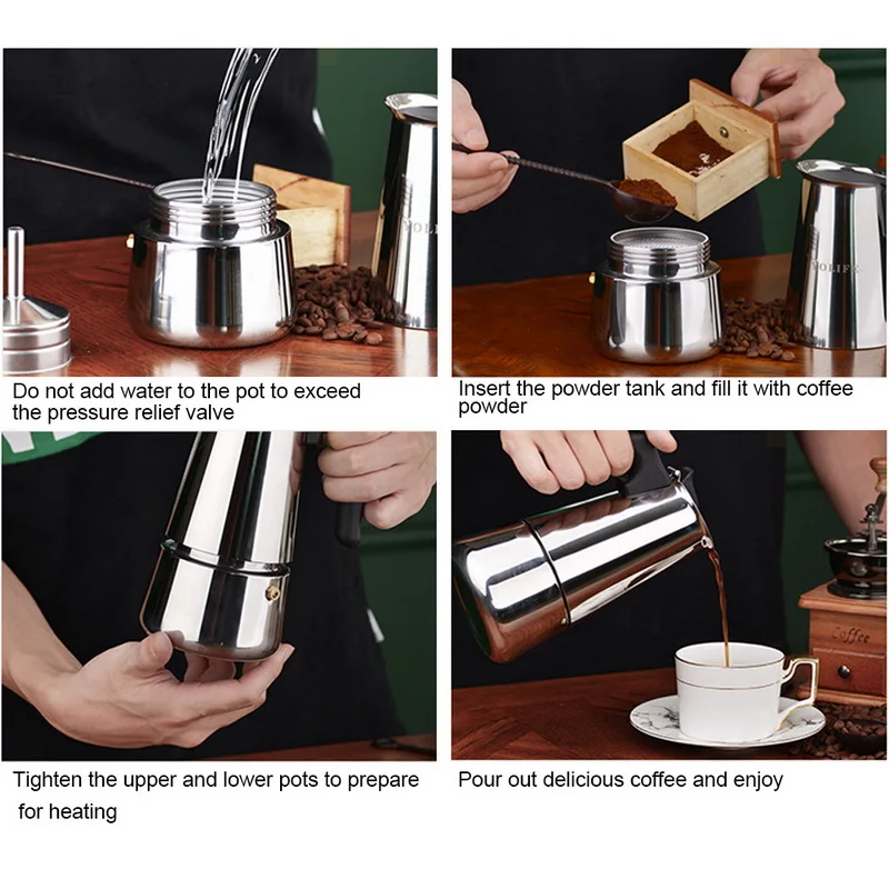 -- Black handle: with a black insulated handle and is suitable for all hobs including induction. Ergonomic design, comfortable to grip. -- Good quality material: made of stainless steel material (including the inner parts such as funnel & filter plate) with ergonomic, heat-resistant handle and lid, food grade material and nontoxic, safe for you and your family. -- Compatible: this item is compatible with induction cooker, electric heating stove, gas stove, alcohol stove, ceramic stove. -- Easy to clean: stainless steel espresso pot is dishwasher safe and hand wash. Dry thoroughly with a towel. -- Suitable: please never use other contents besides coffee, such as, teas, cacao powder, instant coffee or fine ground coffee or it will clog the filter plate. -- How to use: 1. Firstly, fill the lower chamber with cold water just below the valve. 2. Then, insert the funnel and fill it with ground espresso. Remove any coffee grounds on the edge of the funnel. Tightly screw the upper part of the pot on to the base. 3. Heat until the water boils and coffee begins to come out of the center post. 4. When the top of the pot is full of coffee, remove the item from stove. --Warm tips: 1. Heat may be too high if pot produces coffee with a burnt like taste. Try lowering the heat. 2. Please do not use in the dishwasher. 3. Please clean it with boiled water at least three times before the first use. 4. Please do not boil the pot when there is no water in it. 5. Please ensure the flame is not larger than bottom of pot. 6. Please do not remove and clean the coffee maker before it become cold. |