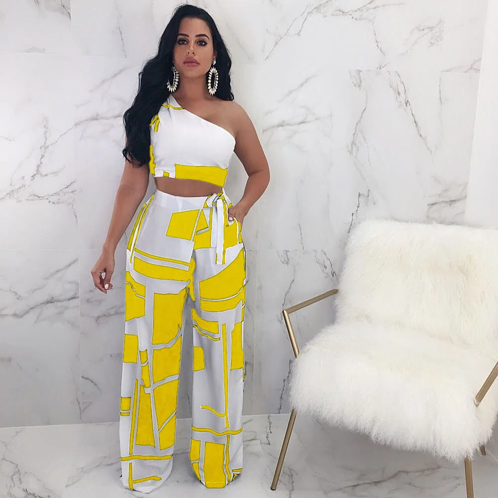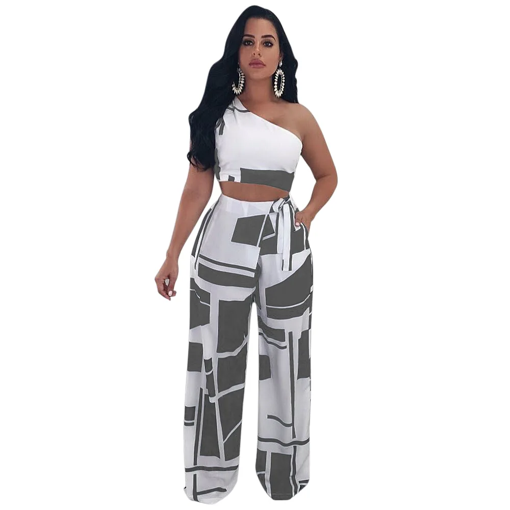 Высококачественная Повседневная Женский комплект 2 шт. 2020 года с принтом на одно плечо без бретелек, Длинные свободные штаны DW423 <