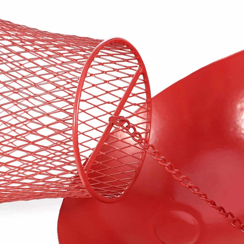 На части корпуса нанесен сетчатый дизайн, который притягивает больше птиц для ловли пищи. Длинный трос можно повесить на крючок или дерево. Продукты легко помещаются при открывании крышки.