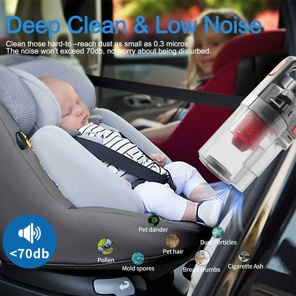 Clean Anywhere&Low Noise:14.8ft(4.5m)long power cord,longer than regular car vacuum with the persistent suction so you can get rid of all annoying rubbish in your car even they fall into hard-to-reach area.With different nozzles,the portable vacuum cleaner can be both used in wet or dry condition under 70 decibels super low noise level,no worries about being disturbed,bring you a pleasant mood.