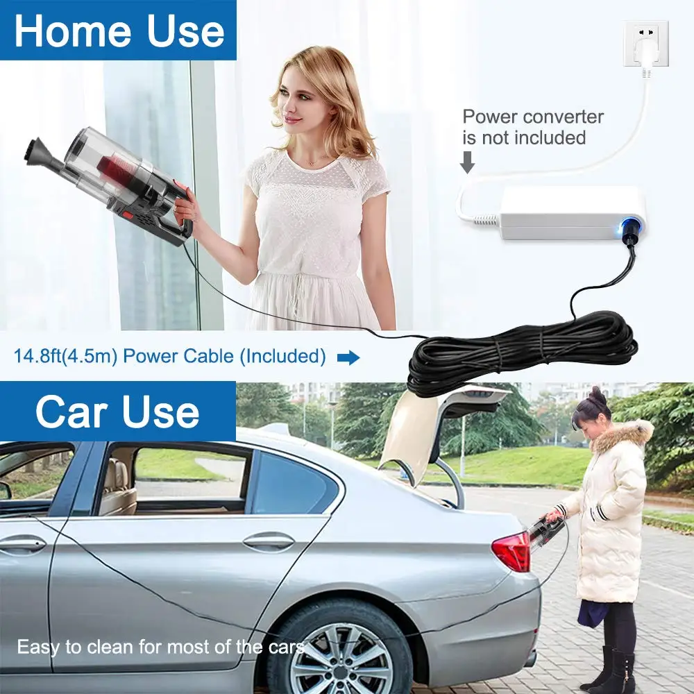 More Efficient than Cordless Vacuum Cleaner:The advantage of corded car vacuum cleaners is their power which translates to better cleaning efficiency.Since the device is plugged directly into car's 12-volt battery system,you can draw as much power into the device to ensure greater vacuuming efficiency.This helps save time in cleaning and ensures deeper,more thorough cleaning.Note:If you want to use it at home,you need a universal AC/DC power socket adapter converter.