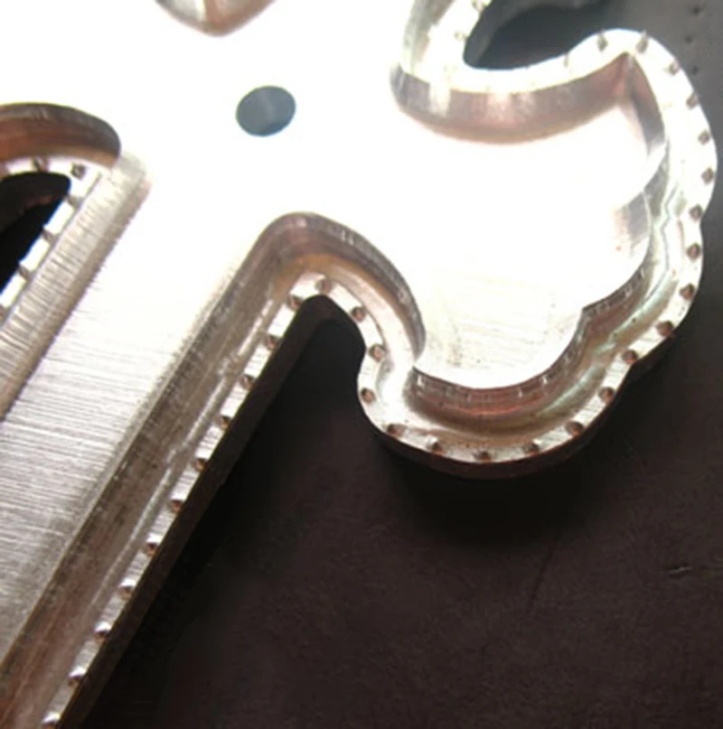 Его можно использовать в качестве кожаного выреза, вырезанный крест также может использоваться в качестве небольшого украшения Толщина кожи на рисунке составляет 3 мм, а расстояние между отверстиями для позиционирования рядом с крестом-4 мм. Алюминиевая штамповка не может быть использована молотком! Друзья без гидравлического пресса или аналогичного гидравлического оборудования, пожалуйста, не покупайте! Слот на штампе оставит только некоторые отметки на вырезанной коже и не проникает в кожу. Это для вашей справки. Почему в материалах используется 7075 Жесткий алюминиевый сплав? Причины следующие: 1 твердость алюминиевого сплава намного хуже, чем у нержавеющей стали, но она может удовлетворить требования общего времени резки в реальных экспериментах. После повторных экспериментов и отзывы клиентов, количество повторных порезов составляет около 1500-2000 раз в чехол правильного использования, и текущий минимум составляет около 1500 раз (отзывы клиентов). Мы использовали самую длинную резная форма более 3000 раз, который используется в течение более 8 лет. 2 формы в основном используются для крупномасштабного производства кожаных изделий, но также надеемся сохранить преимущество ручной прошивки и как можно больше клиентов, чтобы купить кожаные изделия на заказ. Это не подходит для высококачественной ручной работы, но это очень полезный инструмент для вводной обучающей студии. Самым большим недостатком алюминиевой матрицы является количество порезов. Алюминий по-прежнему не так хорош, как сталь, это объективное наличие. Мы стараемся сделать эту модель идеальной из следующих пунктов: 1. При проектировании метод обработки полностью считается гидравлической обработкой. Гидравлическая обработка не требует острых краев (острое лезвие-это острое оружие для использования ручного молотка). Таким образом, край алюминиевого материала, мы искусственно утолщаем, уменьшаем остроту и увеличиваем долговечность. 2. При обработке было обнаружено, что если алюминиевая Форма инструмента подвергается равномерному давлению, которое находится прямо вверх и вниз, как правило, не будет деформации формы ножа и рта ножа. Однако алюминиевая форма для инструментов подвергается боковому воздействию при давлении. Очень легко деформируется. Например, используйте прокладку, которая имеет вмятину, например, используйте самодельный домкрат, который не был откалиброван. Наиболее распространенный метод повреждения формы ножа заключается в том, что вы в последний раз вырезаете остатки кожи, которые не были очищены вовремя. Пока есть кусок кожаного остатка, который не был очищен под кожаным материалом, который нужно вырезать, алюминиевая форма ножа просто режет остатки кожи. Пресс-форм почти 100% деформируется. 3 при проектировании мы постараемся спроектировать отверстие для позиционирования, дизайн режущей кромки также будет иметь изогнутую конструкцию. Выше приведены недостатки, давайте обсудим преимущества: 1 алюминиевая штамповка не режется резкостью, а давлением. Это давление также применяется к кожаным волокнам, особенно к кожаным волокнам по краям. После обработки кожаные края будут легче. 2 это дешевле, чем CNC прецизионная сталь.