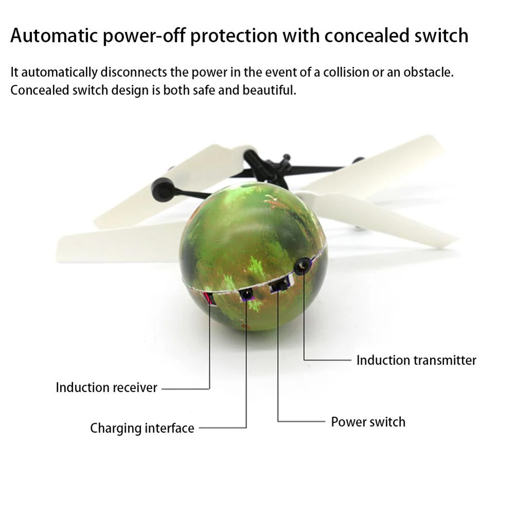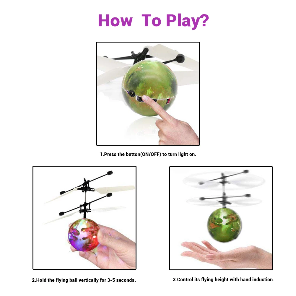 Руководство простое управление: Включите переключатель в нижней части шар-вертолет, удерживайте его непосредственно в течение 2-3 секунд, затем летите автоматически, вручную Управляйте вверх и вниз. Он будет лежать на несколько дюймов над вашей рукой, тогда вы можете командовать обеими руками, а затем упасть на землю или столкнуться с препятствиями.