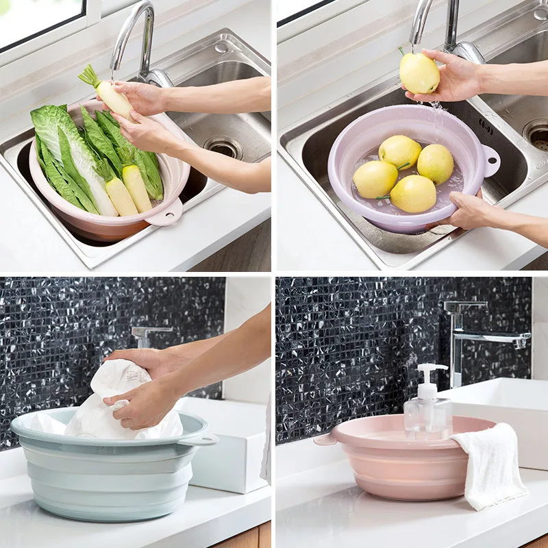 Складной умывальник, изготовлен из материала PP + TPR, с достаточным материалом, толстый и водонепроницаемый, не деформируется и не выцветает, сильный анти-падение, не легко повредить, большой, средний и маленький по желанию, используется для мытья овощей, мытья лица, стирки, купания и т. д. Подходит для дома, прогулок и переноски, Складное хранение, с висячими отверстиями, можно повесить и хранить, экономя пространство