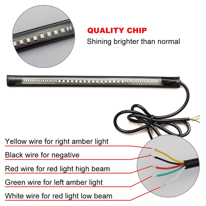 * Подключение провода: черный провод для отрицательного, красный провод для красного света дальнего света, белый провод для красного света ближнего света, желтый провод для правого янтарного света, зеленый провод для левого янтарного света