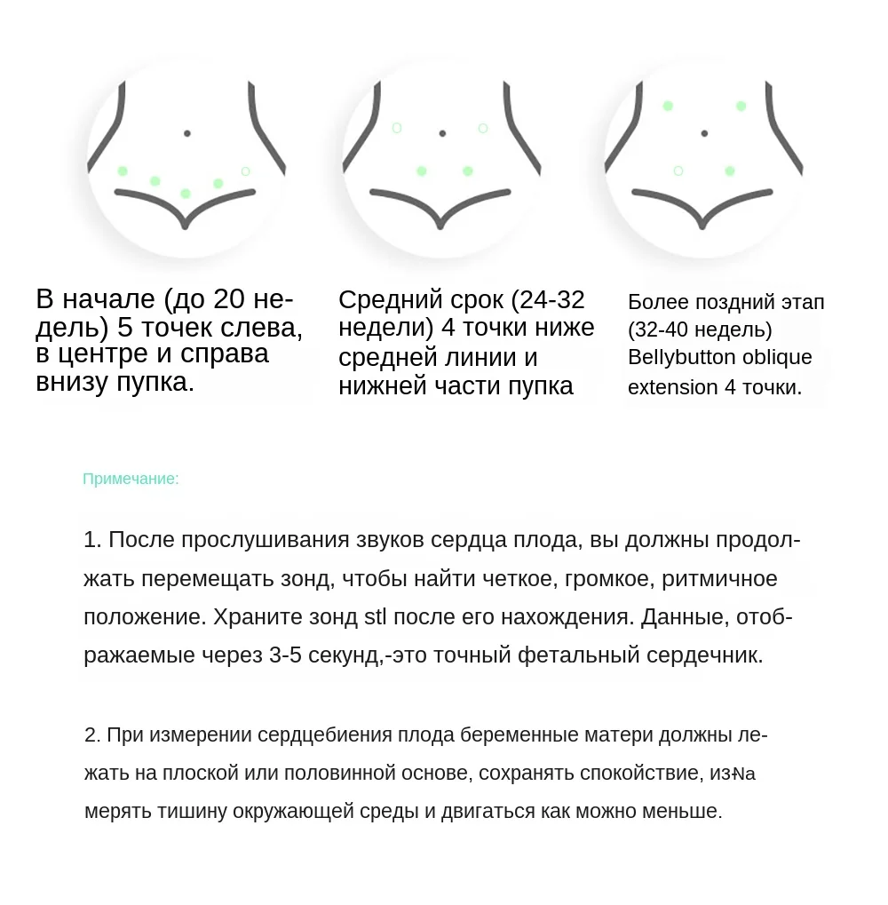 1. Прежде чем использовать его в первый раз, убедитесь, что 2 батареи находятся в 2. Нажмите кнопку питания, чтобы включить, а затем отрегулируйте громкость 3. Ложитесь на подушку, чтобы ноги были ровными и расслаблены 4. После прослушивания звука сердца плода, вы должны продолжать движение зонда, чтобы найти четкое, громкое, ритмичное положение. Держите зонд еще после его обнаружения. Данные, отображаемые через 3-5 секунд,-это точное измерение сердцебиения плода. 5. При измерении сердцебиения плода беременным Матерям следует лежать плоско или наполовину лежать, сохранять спокойствие, измерять в более тихой среде и перемещаться как можно меньше.