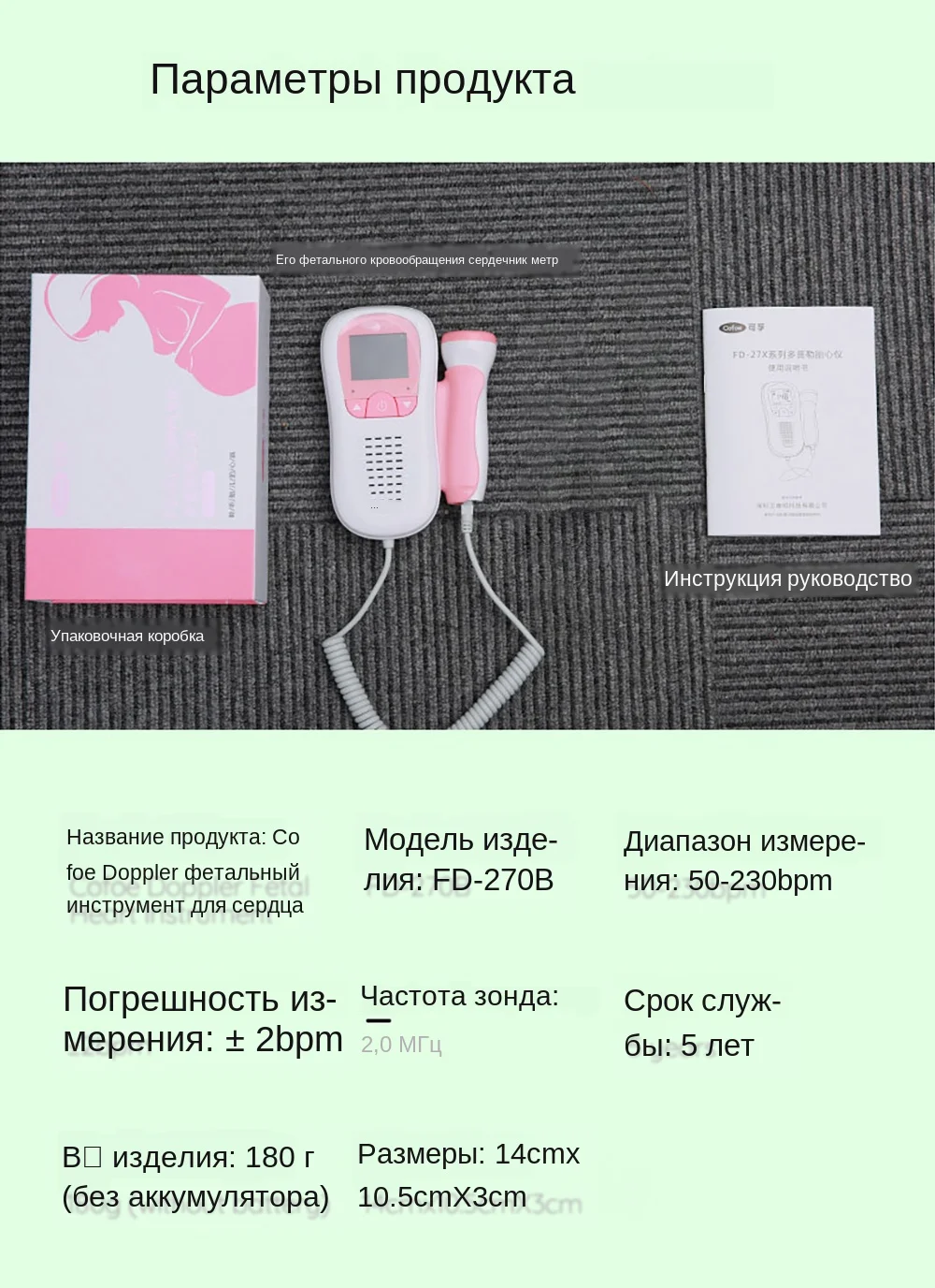 Фетальный допплер-это ручное устройство для обнаружения сердцебиения плода, используемое допплеровской теорией. Он выводит звуковые сигналы через наушники. С простой и удобной работой, его можно использовать в домашних условиях для ежедневной самопроверки беременной женщины, осуществляя ранний мониторинг и заботу о жизни. Примечание: ♥Аккумулятор в комплект не входит, из-за того, что он не может быть отправлен, пожалуйста, примите это во внимание! ♥Руководство по эксплуатации данного товара на китайском языке, если вам нужно руководство на английском или русском языке, пожалуйста, свяжитесь с нами.