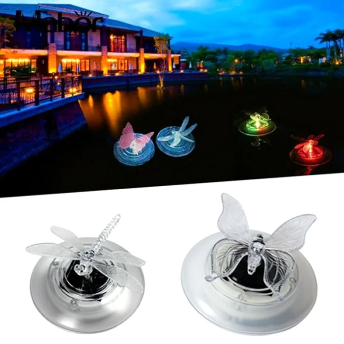 Features:Solar powered light, 7 color changing LED, water floating lights,dragonfly or butterfly ornament