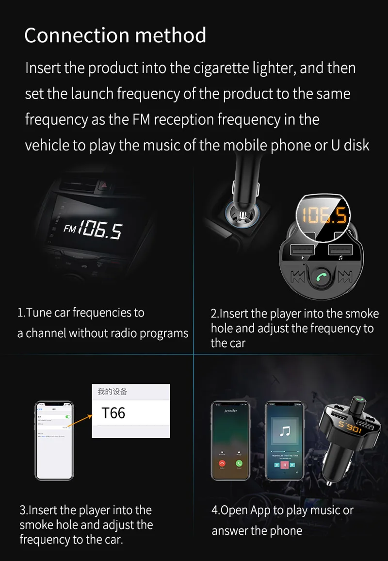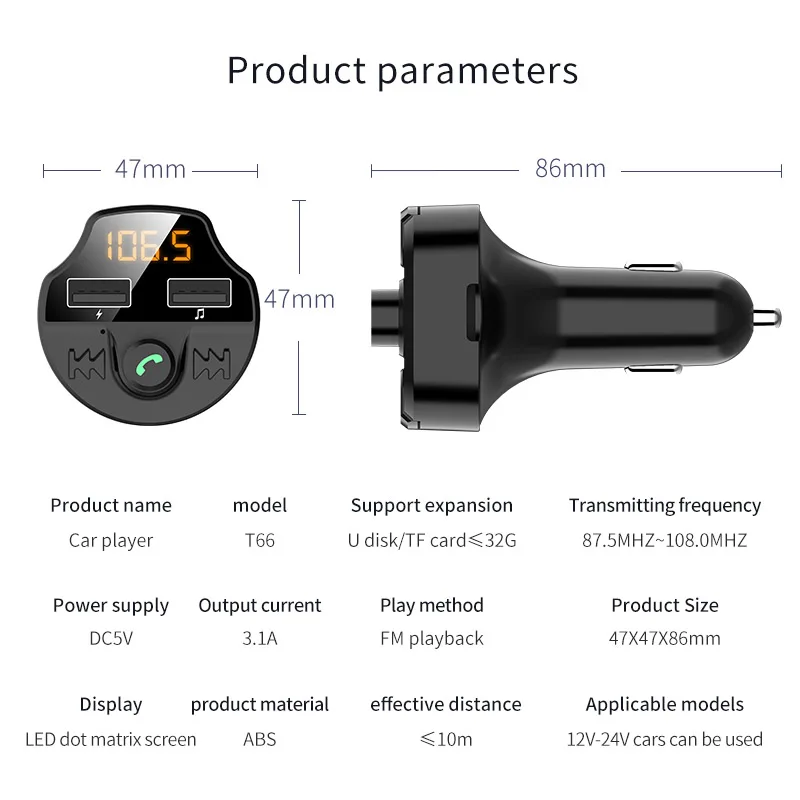 Автомобильный FM MP3-плеер Bluetooth 5,0 с отключением памяти T66 двойной зарядное устройство USB для 12-24 В Автомобильная поддержка шумоподавление TF карта Особенности: Сопротивление разрыву CVC умное снижение уровня шума Автомобильный MP3-плеер принимает CVC интеллектуальное шумоподавление, чтобы обеспечить вам высокое разрешение и высокую производительность стерео. Не застревает, плеер может поддерживать музыку без потерь, такую как MP3/FLAC/WMA/APE. Двойные usb-порты Два порта USB обеспечивают интеллектуальную быструю зарядку 3,1 А. И вы можете одновременно зарядить два цифровых устройства. Bluetooth 5,0 Автомобильный MP3-плеер совместим с системами android и ios. Bluetooth 5,0 обеспечивает более стабильную и быструю передачу данных. Он также поддерживает громкой связи, что легко получить звонок на автомобиль. U диск/TF карта plug and play Автомобильный MP3-плеер может не только регулировать частоту автомобильного радио и частоту mp3, но также поддерживает u-диск и tf-карту простым управлением. Подключите и играйте, вы получите больше песен, чтобы играть. Сильные Совместимость Автомобильный MP3-плеер совместим с большинством приложений, музыкальных приложений и программного обеспечения для чата, подключите плеер к телефону, плеер будет совместим с большинством приложений на вашем телефоне. Автоматическая регулировка громкости Автомобильный MP3-плеер может автоматически уменьшить громкость музыки при навигации и вернуть громкость при отсутствии навигации. Функция отключения памяти После выключения питания Автомобильный MP3-плеер может автоматически переключаться на частоту памяти и песенку перед выключением. (случайное отключение питания, запомните текущее положение проигрывающей в данный момент песенки, выключите питание в режиме паузы музыки, вы можете запоминать второй.) Смарт-чип Автомобильный MP3-плеер имеет интеллектуальный основной кристалл и восьмиконтурную защиту, которая безопаснее и безопаснее в использовании. Функции защиты включают защиту от перенапряжения, защиту от перенапряжения, защиту от перегрузки, обратная вставка, защиту от перегрева, защиту от короткого замыкания, защиту от перегрузки по току и электромагнитную защиту. Применение: Вставьте продукт в прикуриватель, а затем установите частоту запуска продукта на ту же частоту, что и частота приема FM в автомобиле, чтобы воспроизвести Музыку мобильного телефона или u-диска. Подключите телефон к плееру. Затем откройте приложение, чтобы воспроизвести музыку или ответить на телефонный звонок. Параметры: Тип: автомобильный mp3-плеер Количество: купальное полотенце, 1 шт Материал: АБС-пластик Цвет: черный Применимые модели: 12-24 v автомобили Поддержка расширения: U диск, tf-карта (макс. 32G) Напряжение: 5 В постоянного тока • Сила тока: 3.1A Экран: светодиодный Экран Эффективное расстояние: менее 10 м Размер: 85*47*46 мм (Д * Ш * В) Вес нетто: 30 г Посылка включает в себя: 1 * автомобильный mp3-плеер 1 * Руководство пользователя