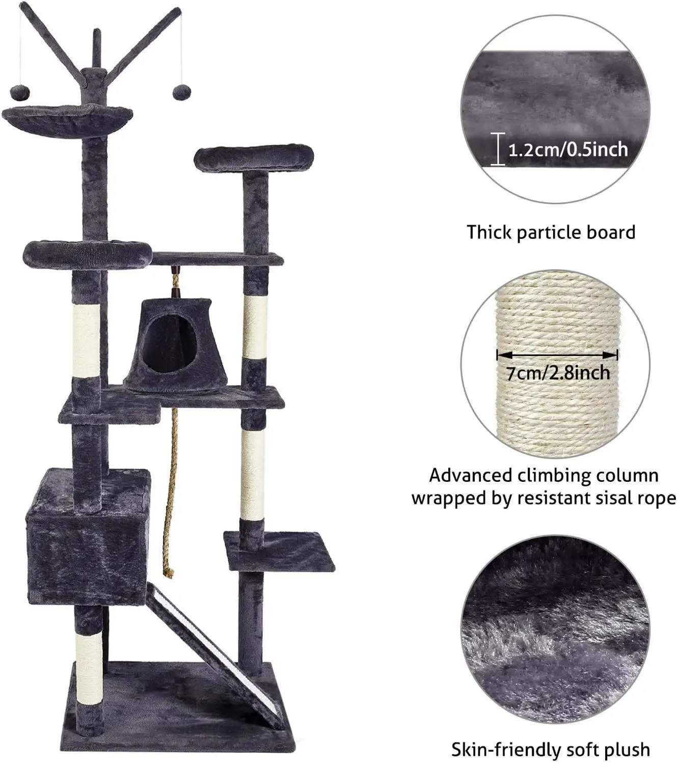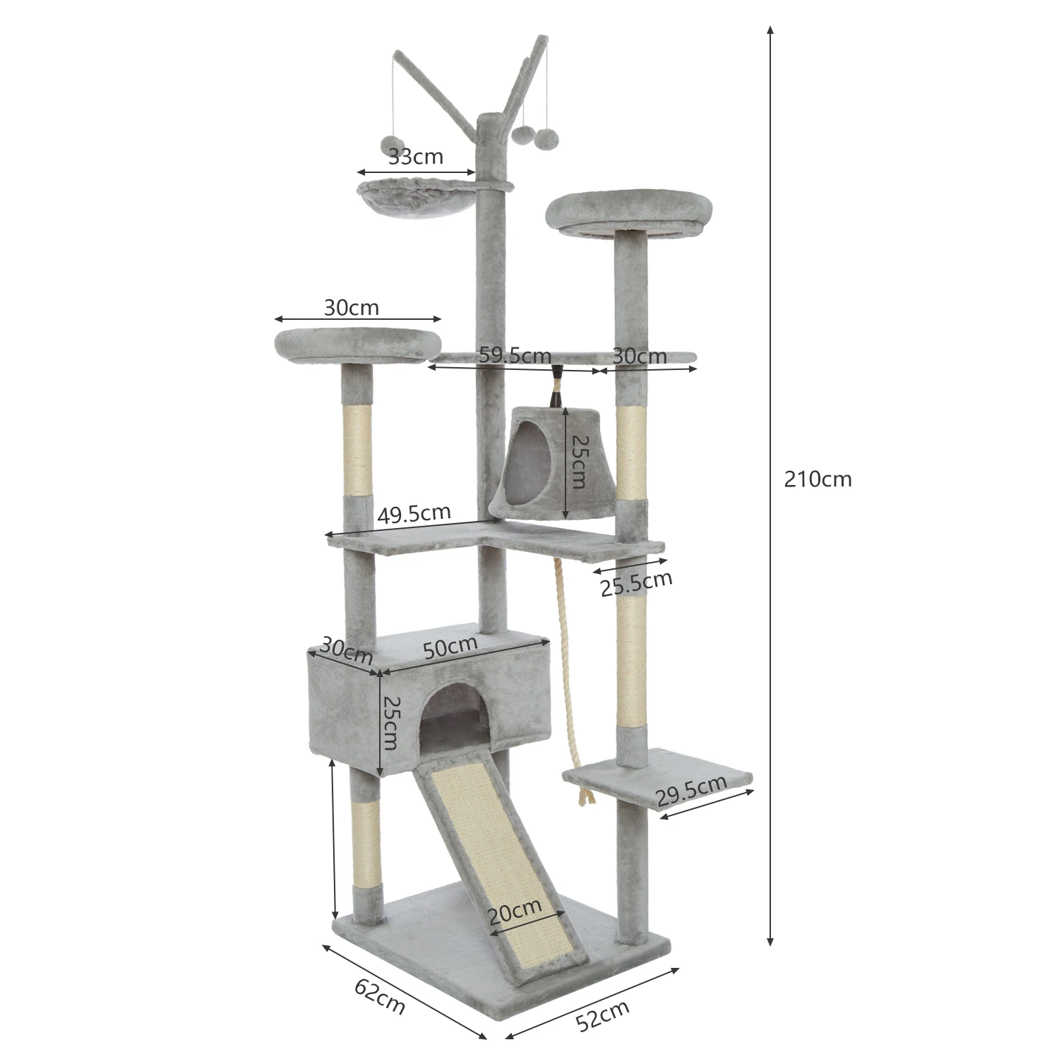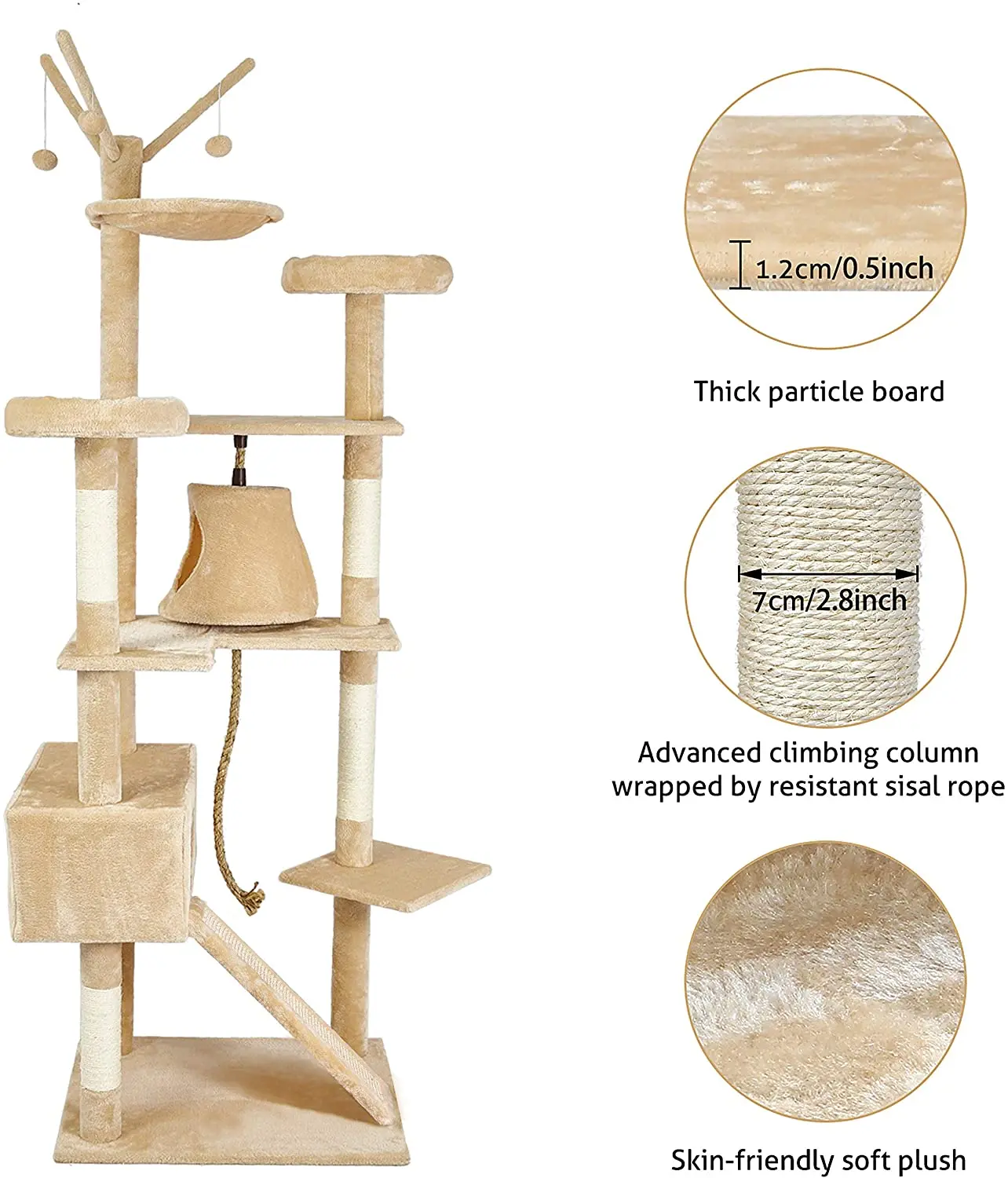 Thickened large waist base - 210 cm (height) tall, a luxury cat climbing frame incorporating entertainment, activity and leisure. The base is thickened and the stability is improved. It can accommodate four or five cats maximum at the same time.