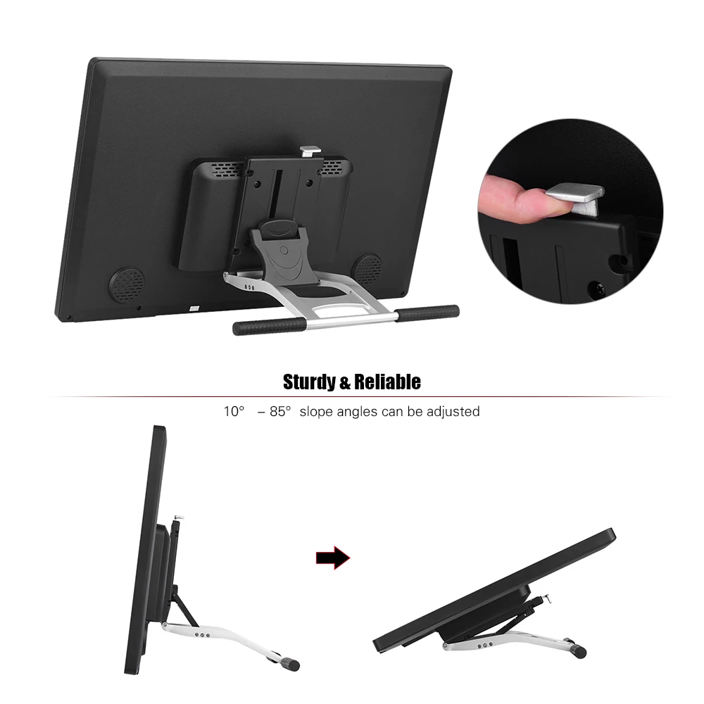 【Регулируемая подставка и лицевая сторона:С сильной регулируемой подставкой для удовлетворения различных потребностей углов, Углы наклона 10 °-85 ° для регулировки, прочные и надежные. Экран с 5 обычными функциональными клавишами быстрого доступа, чтобы соответствовать привычке дизайнера. С несколькими интерфейсами на задней панели, HD IN, usb-портом и DC IN.