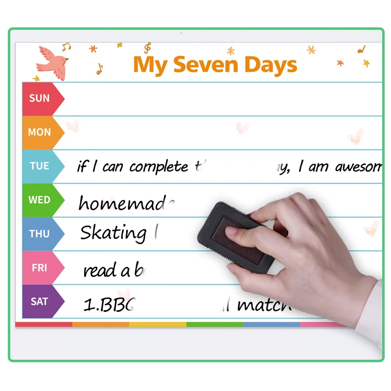 Описание: магнитный календарь, Детские chore chart, магнитное расписание, to-do list Материал: магнитный порошок, резина, HD печать, ПЭТ пленка. Особенности: самомагнитный, гибкий, поддержка письма, портативный, прочный. Размер: 42*30 см Толщина: 0,4 мм Стираемость: сухая стирается, долговечная яркая и легко очищается. Применение: нанесите на поверхность из железа, например, на холодильник и так далее.