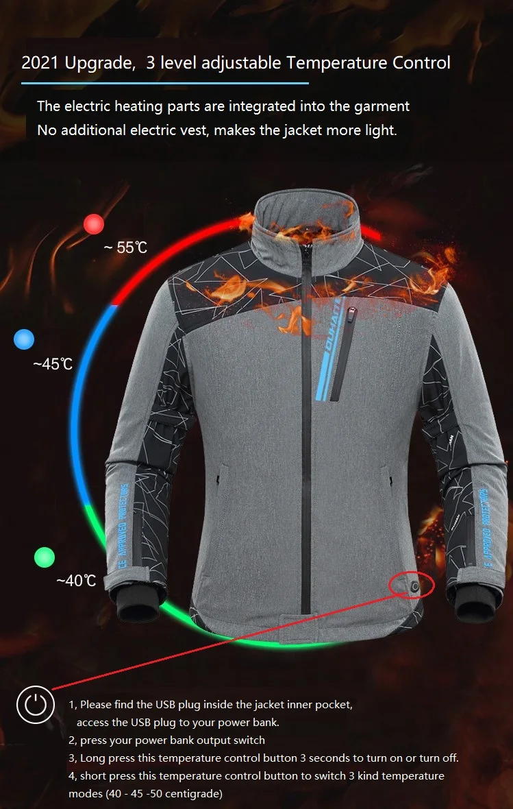 | Новая модернизированная DUHAN USB нагревательная куртка Обновление № 1: детали электрического отопления интегрированы в одежду, без дополнительного электрического жилета, делают куртку более светильник.Обновление № 2: Добавьте 3 уровня регулируемого контроля температуры, только одной кнопкой управления. |