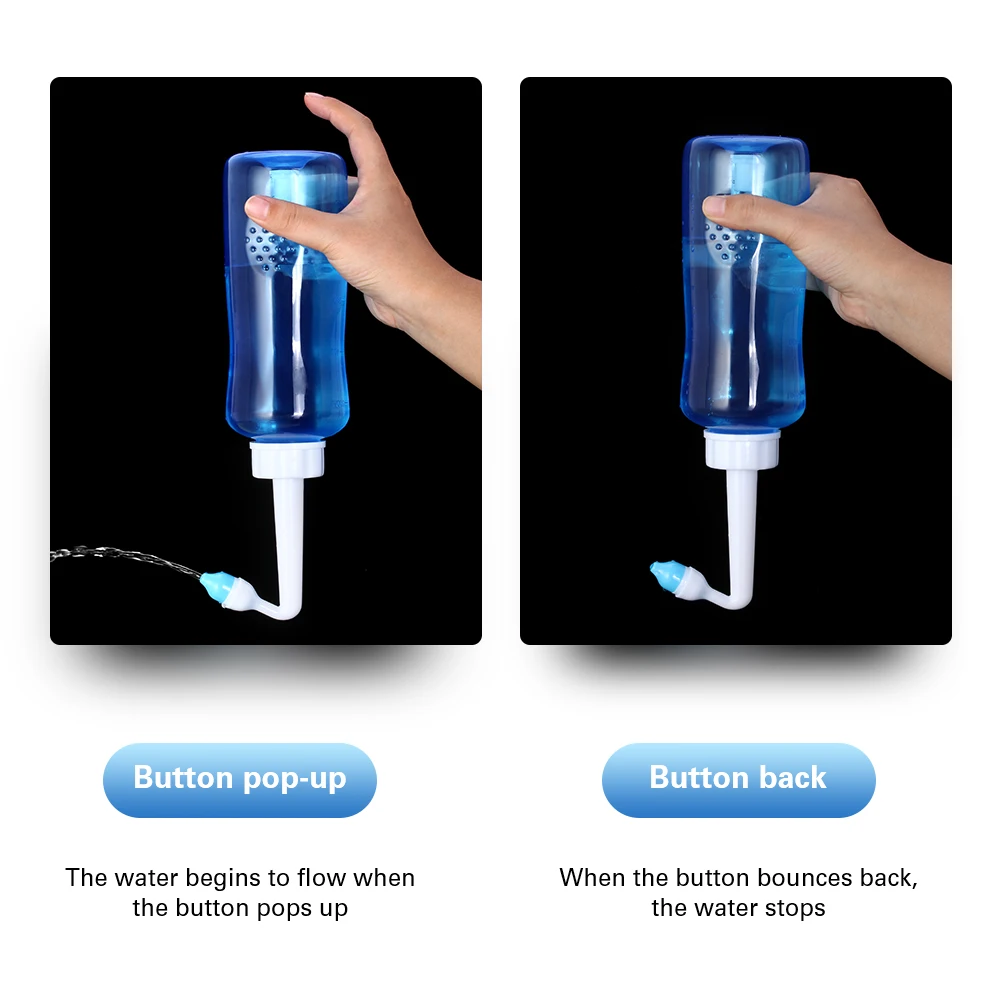 4. Правильная осанка: Держите верхнюю часть тела, наклоняясь вперед, с видом вниз и слегка наклоняясь головой, удерживайте бутылку вверх дном и аккуратно вставьте кончик в одну ноздрю. Расслабьтесь, слегка открывайте рот и Дышите (через рот). Не задерживайте дыхание. Не пропускайте воздух через нос. Нажмите кнопку клапана в нижней части бутылки с водой (рис. 1), и раствор будет автоматически течь. Не выдавливайте бутылку воды. Раствор на краску попадет в ноздри, намазывает нос, пазух и вынимает другие ноздри. При чистке одной ноздри отпустите кнопку, чтобы остановить раствор. Поверните, чтобы помыть оба Ноздря.