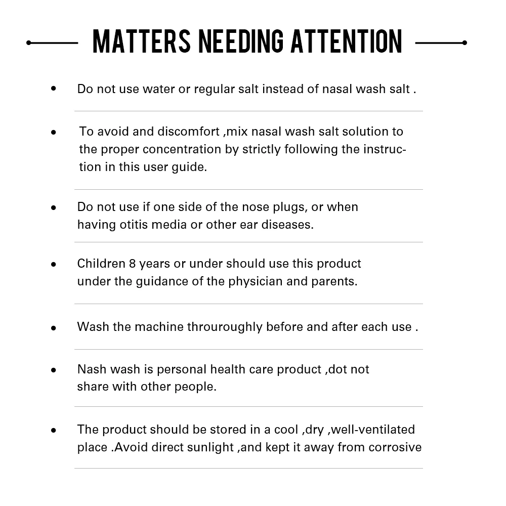 2. Чтобы избежать дискомфорта, Смешайте раствор соли для мытья носа с надлежащей концентрацией, строго следуя инструкции в этом руководстве пользователя.
