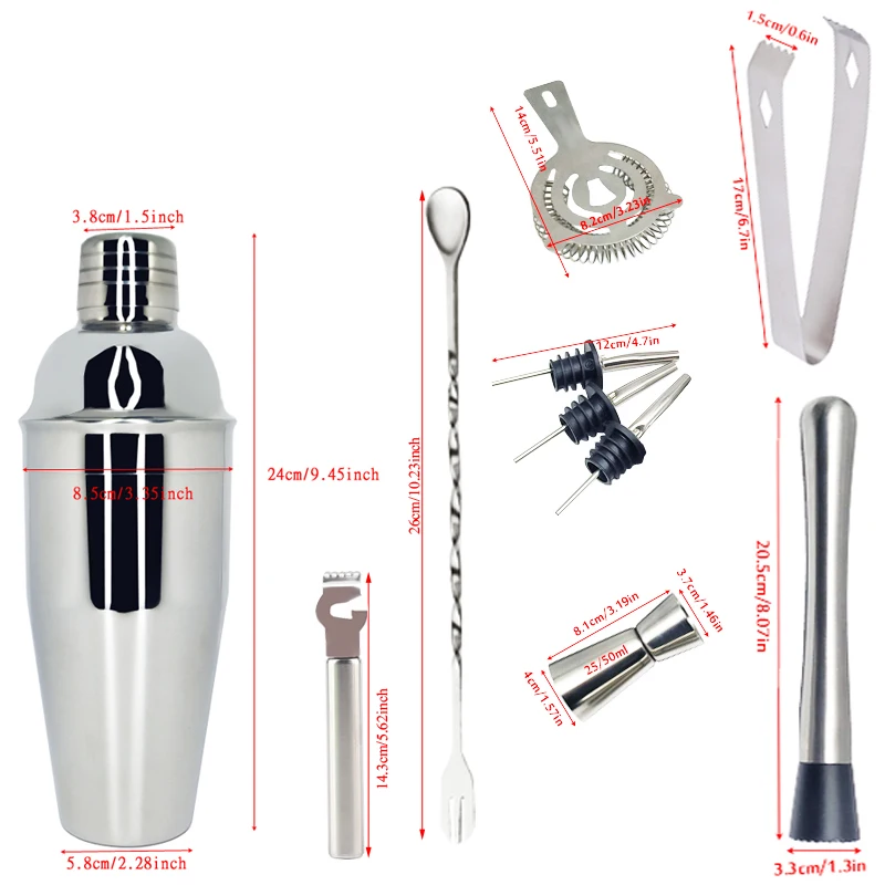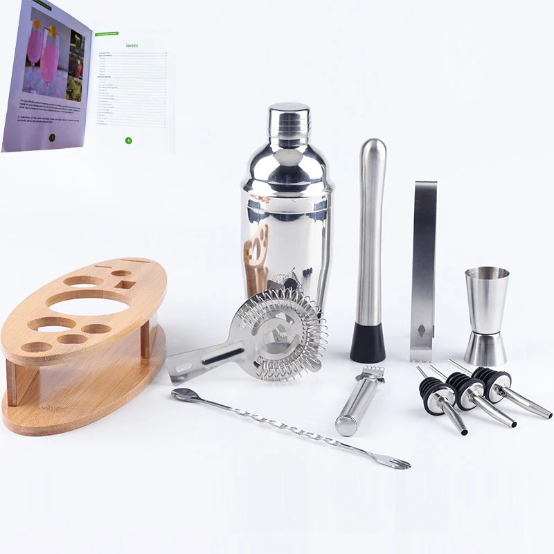 1xшейкер/3 x пробка для бутылки/1x25/50 мл, мерный стакан/1 x барный пестик/1 x ситечко для льда/1 x вилка ложка/1 x лимон пластический строгальный станок/1 x форма для льда/ 1 x Рамка для винной стойки/1 x коктейльный рецепт.