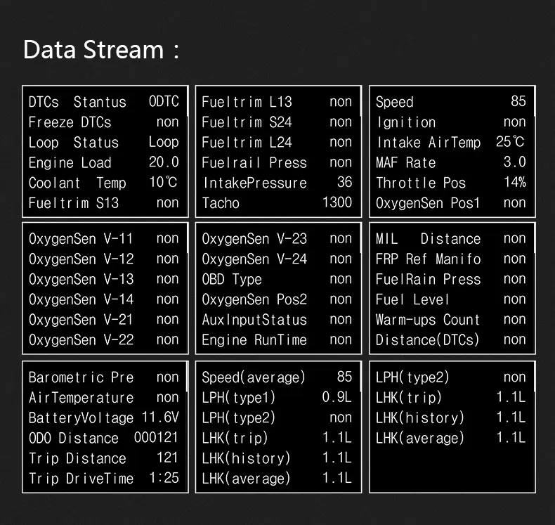 7. Rich Contents: vehicle speed, engine RPM, water temperature, voltage, instantaneous fuel. consumption, average fuel consumption, driving distance measurement, driving time, low voltage alarm, high water temperature alarm, over speed alarm, engine fault code alarm, eliminate the fault code, freely switch between kilometers&miles.