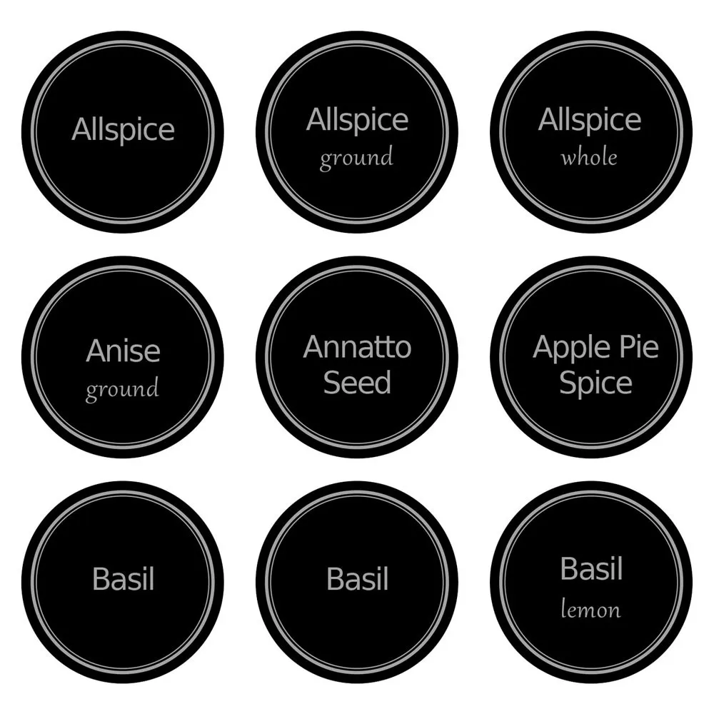 Чехлы Все общие специи, включая различные версии и сорта и дополнительные Этикетки для более распространенных специй, таких как базилик и чеснок.