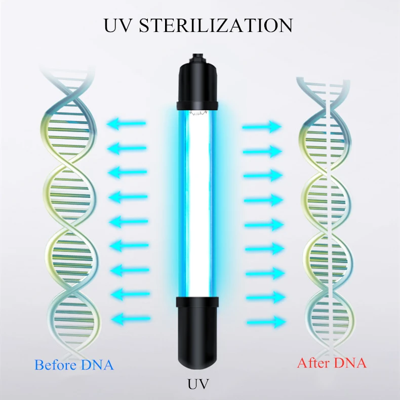 -При ультрафиолетовом облучении, разрушена DNA микроорганизма и его способность к воспроизводству теряется, и большая часть бактерий и водорослей в воде убита, тем самым восстанавливая здоровую воду.