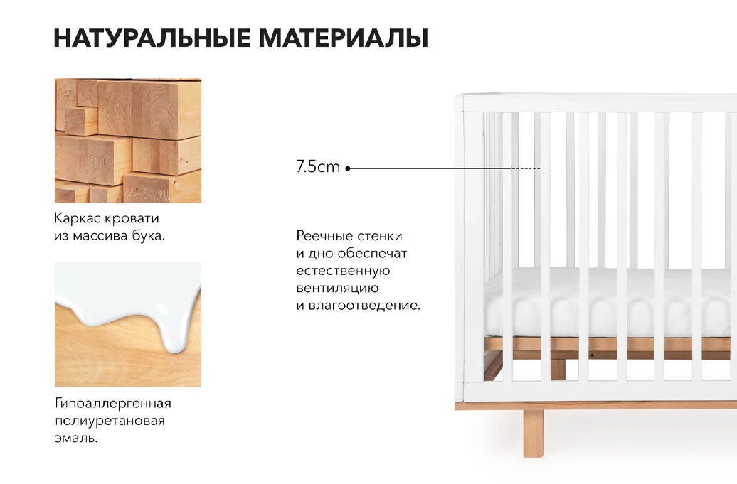 Стенки и дно кроватки – реечные, что создает естественную вентиляцию матраса и спального места и способствует отведению влаги. Благодаря такой конструкции кроватки малыш всегда в поле зрения мамы.