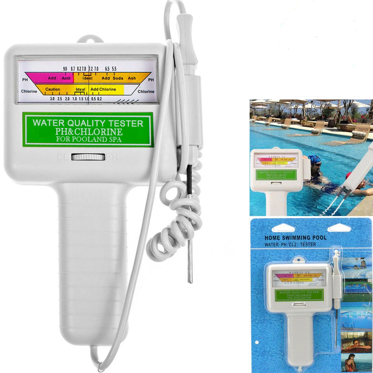 Это электро-тестер для тестирования уровня pH и хлора (Cl2) в воде. Хлор является наиболее часто используемым дезинфицирующим средством для воды, убивая бактерии, водоросли и микроорганизмы. Он обеспечивает очень быструю и удобную альтернативу обычным испытательным бумагам и жидким испытательным комплектам, что идеально подходит для повседневного мониторинга уровня pH и хлора бассейнов, спа и различных источников воды. Он прост в эксплуатации, не требует больше химических веществ. Большой экран быстро показывает результат теста с высокой точностью. Легкий и компактный, легко носить с собой.