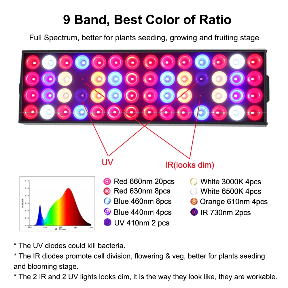 1 шт. IR 730nm: способствует делению клеток, цветению и ведению, лучше для растений, сеящих и цветущих сцен (выглядит тусклым).