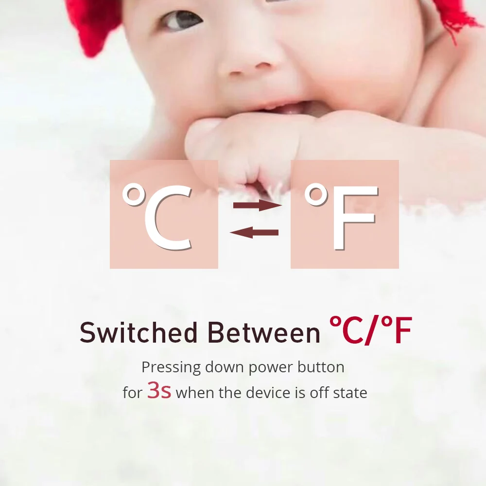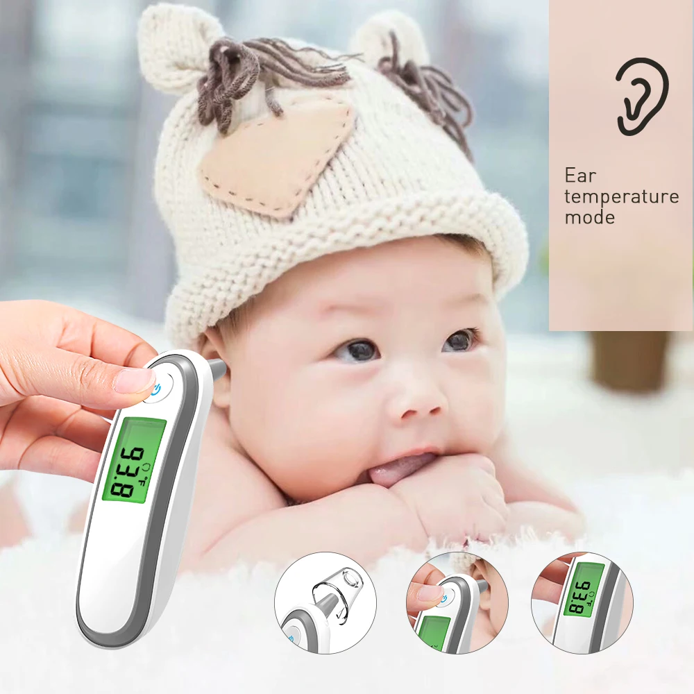 Легкое и быстрое управление -- управление одной кнопкой/легкое и мгновенное переключение. Автоматическое отключение питания через 60 секунд. ФУНКЦИЯ ЗАПОМИНАНИЯ --Запоминание последних 12 результатов измерений для отслеживания изменений температуры. Безопасный и надежный-использует новейшие технологии инфракрасного обнаружения, точные и надежные, по сравнению с традиционным ртутным термометром, во избежание вреда от паров ртути, поглощаемого в режиме двойной функции тела-режим температуры уха и лба. Измерение лба всего за 3 секунды, измерение ушей всего лишь незначительно (1 секунда). Внешнее воздействие лба больше, это нормально, чтобы получить 1-2 F (0,6-1,2 C) разница между измерением уха и измерения лба. Это НЕ связано с неточностью термометра. Рекомендуется измерять температуру в ухе. ТРЕХЦВЕТНАЯ ПОДСВЕТКА И СИГНАЛИЗАЦИЯ ПРИ ЛИХОРАДКЕ --Зеленый индикатор (ниже 37,5 C/99,5 F), желтый индикатор (37,6 C-38,0 C/99,68 F~100,4 F), красный индикатор (выше 38,1 C/100,58 F). Автоматическая сигнализация при лихорадке, когда температура выше 38 C/100,5 F. Изменение режима --Автоматическая смена лобного режима измерения (УШНОГО режима) при установке колпачка (снятии колпачка)