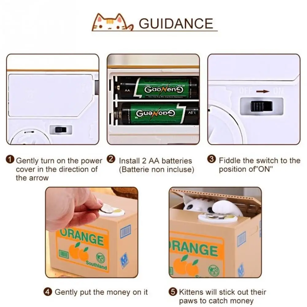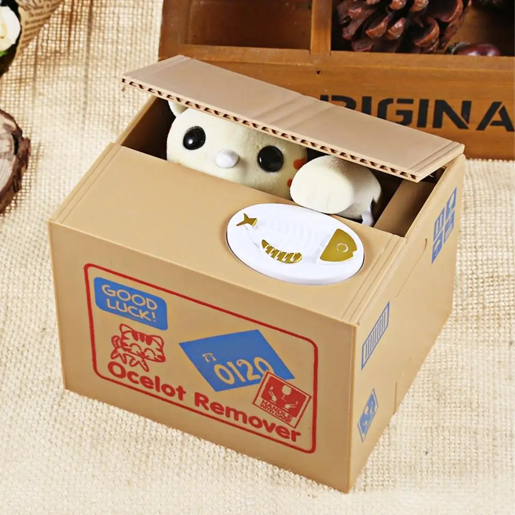 Это автоматический Монетный банк с милым дизайном кошки, который выйдет из картонной коробки и захватит ваши монеты из блюдо для рыбы. Только нужно положить монеты на место для монет, кошка поможет вам взять их, а затем поможет вам сохранить. В нескольких словах, это идеальный подарок для ваших детей и может научить значение экономии денег.