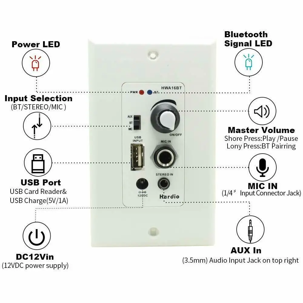 - Микрофон в/USB /AUX-IN/Bluetooth: он оснащен устройством для чтения флэш-памяти USB для воспроизведения мультимедиа, которое также удваивается в качестве зарядного порта для ваших устройств. AUX 3,5 мм аудио входной разъем позволяет подключать и передавать аудио от внешних устройств, настенная тарелка приемник добавляет удобные микрофон подкачки способность вместе с образцами источник устройство регулировки звука.