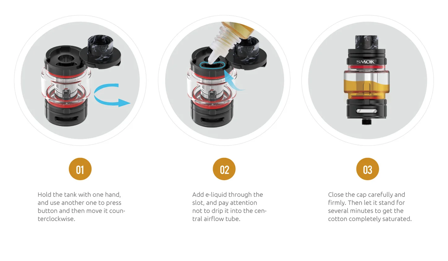 TFV16 оснащен пресс-скользящей системой заполнения верхней части для простой и безопасной заправки жидкости для электронных сигарет.