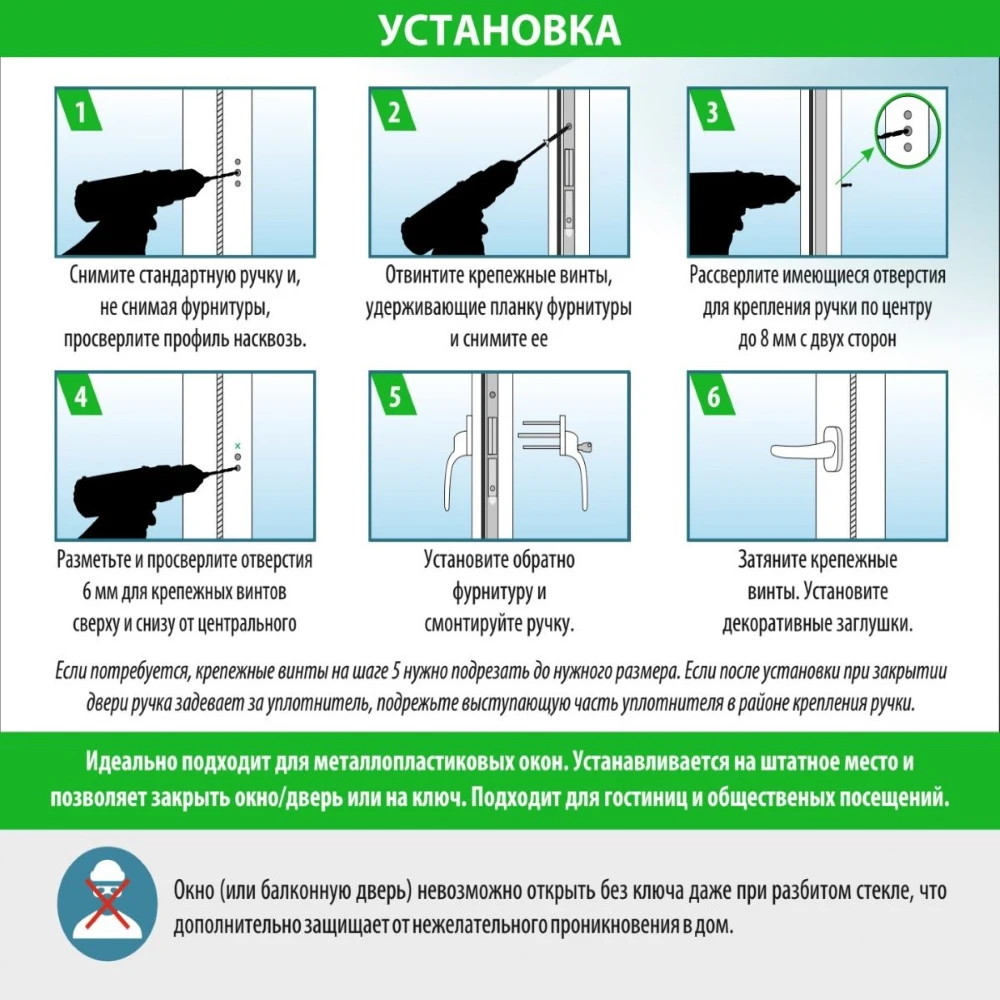 Ручка применяется для любых балконных дверей из металлопластика;