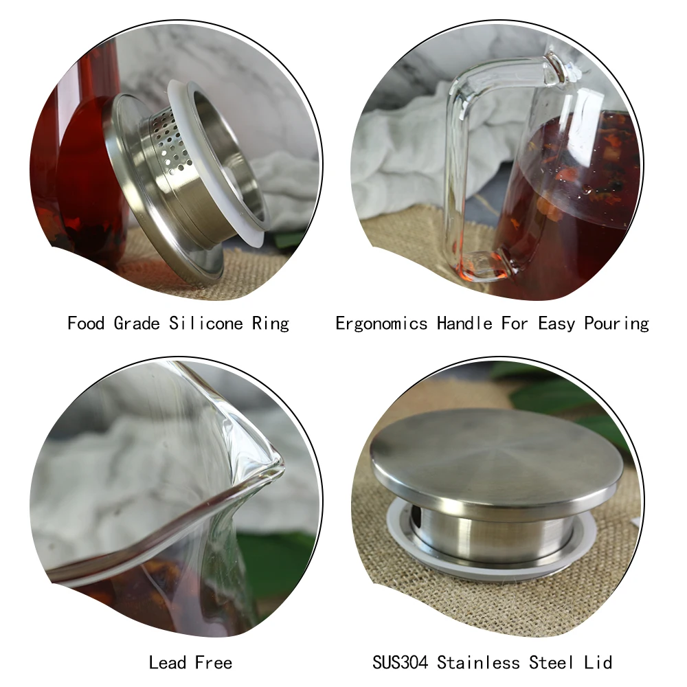 (2) Высококачественный кувшин из боросиликатного стекла ----- без свинца, легкий, прочный, безопасный, выдерживает температуру 0 ℉ до 300 ℉, поэтому вы можете залить в него кипящую воду безопасно.