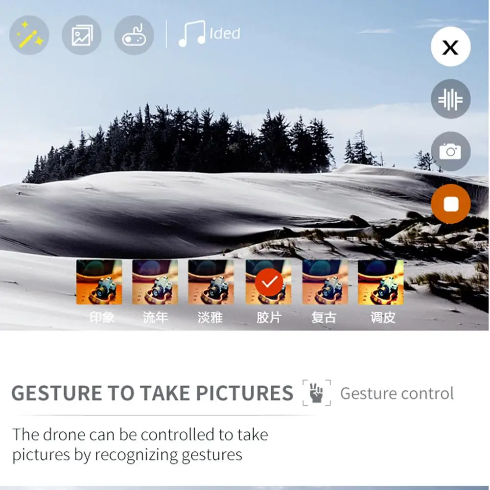 9. оптическое визуальное позиционирование потока, съемка жестов, видео жестов, следование гуманоидов, линза для двойной камеры, 4 вида изображений переключателя (нормальный передний объектив, нижний объектив, на картинке и сплит-экране), управление ладонью, трек полета, вращающиеся линзы, Безголовый режим и MV монтаж.