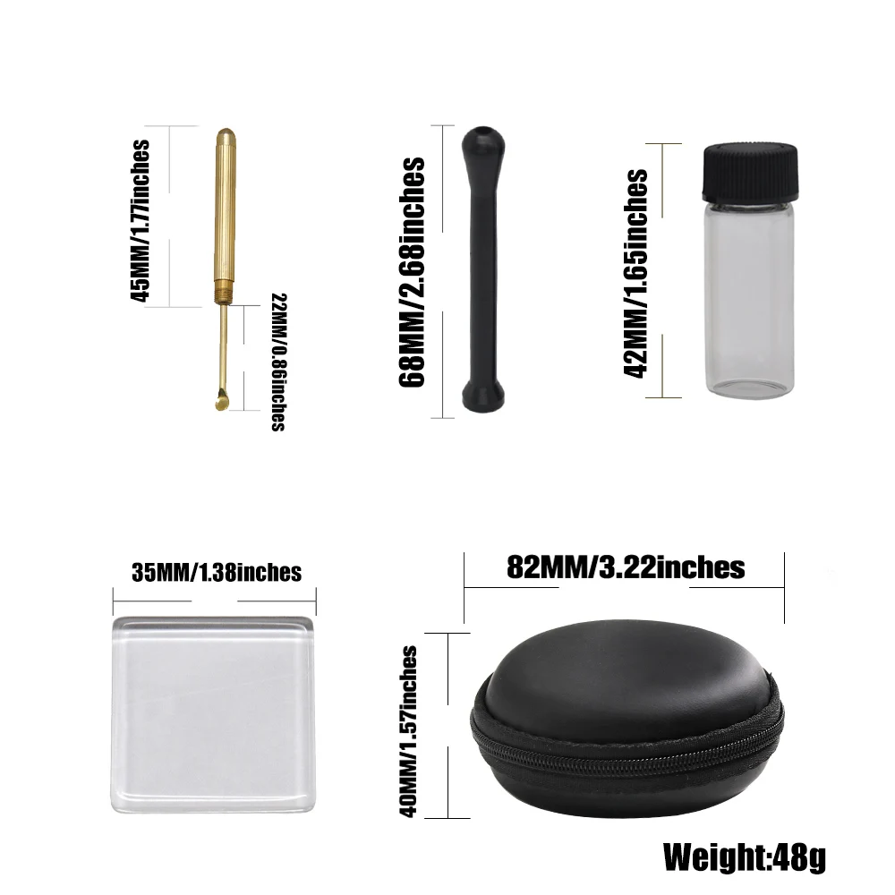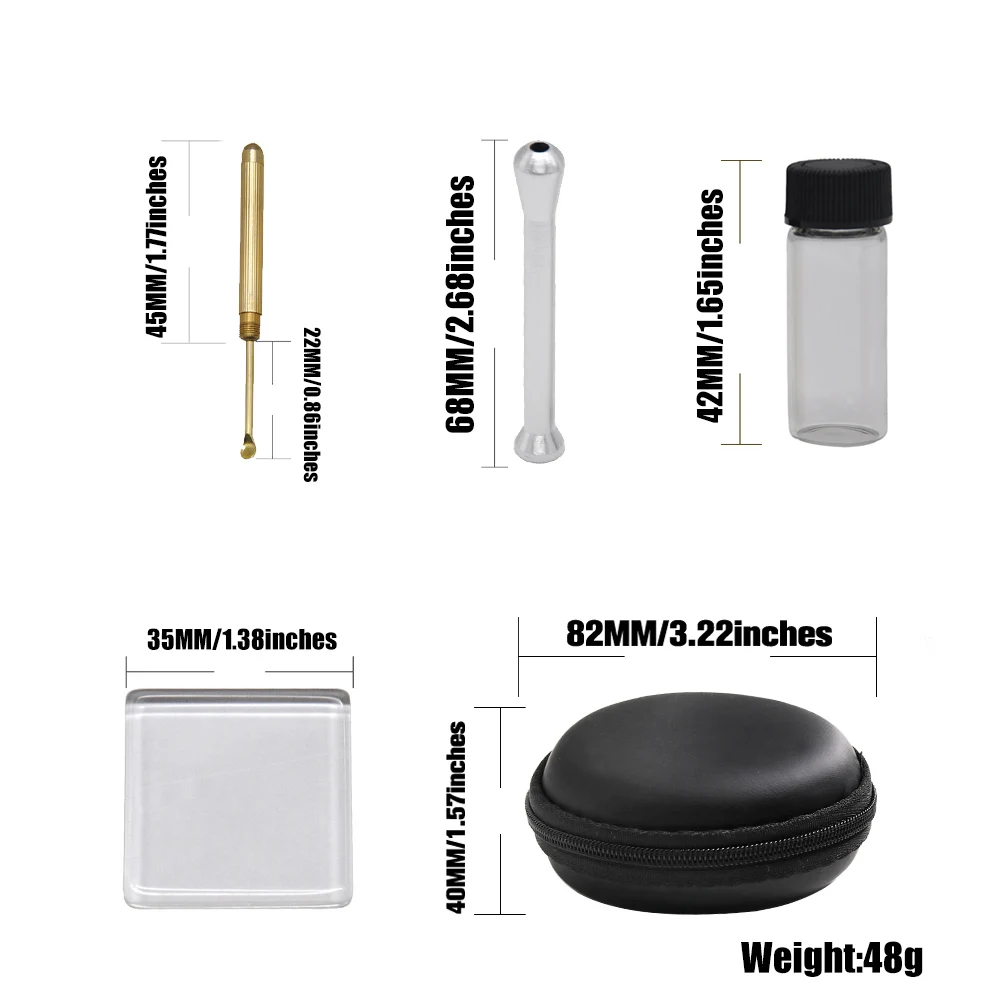 Материал: высококачественный пластик, стекло, латунь и металл Длина ручки: 45 мм/1,77 дюйма Длина ложки: 22 мм/0,86 дюйма Размер табакерной трубки: 68 мм/2,68 дюйма Размер стеклянной панели: 35 мм/1,38 дюйма Размер стеклянной бутылки для таблеток: 42 мм/1,65 дюйма Размер сумки: 40 мм * 82 мм Использование: для нюхания и снортера Вес нетто: 48 г/шт. Дизайн: дыма в любом случае Пакет включает в себя: 1 х медная ложка для храпа 1 х HONEYPUFF алюминиевая табак трубка 1 х стеклянная бутылка для таблеток 1 х стеклянная панель HONEYPUFF 1 x HONYPUFF сумка