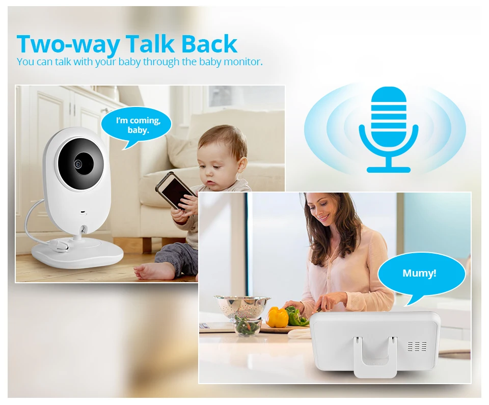 Параметры:Диапазон рабочих частот: ISM 2400-2483,5 МГцМощность передачи: 17dBm максЧувствительность монитора:-88 дБмТип распределенного спектра TX: FHSSТип модуляции: GFSKСкорость передачи данных: 3 Мбит/сДальность передачи: около 10-50 метров дома, максимум 100 метров вне помещения без блока.Диапазон рабочих температур: 0-+ 40 градусовДиапазон рабочей влажности: 85% относительной влажностиЭкологический рейтинг: устройства для использования дома толькоЖК-дисплей (родительский блок)Размер дисплея: 4,3 дюймов TFT lcdРазрешение пикселей: 480*272 RGBУгол обзора: H: 80 градусов, V: 100 градусовТребования к питанию: DC 5 V 1A Вилка питания, 3,7 V литий-полимерный аккумуляторКамера (детский блок)Тип датчика изображения: 1/3 цветной CMOS датчик изображенияЭффективные пиксели: H 640: V 480Объектив: EFL = 3,6 мм, F = 2,8Угол обзора: 70 градусовИК ночного видения: IR 7 светодиодов, IR cut max 5 метровПотребляемая мощность: DC 5 V 1A Вилка питанияДомофон: Встроенный микрофон/динамик Особенности:1. Цифровая радиочастотная модуляция с частотным скачком, более стабильная, цифровая радионяня.2.2.4ггц динамически выбирает чистые каналы, чтобы избежать помех от других устройств 2,4 ГГц, беспроводной радионяни.3. Детская камера с функцией обнаружения температуры и дисплеем в режиме реального времени в ЖК-мониторе, видео-радионяня.4. Поддержка музыкального проигрывателя, воспроизведение спящей музыки, чтобы помочь ребенку уснуть, детский монитор с камерой.5. Защита данных (поддержка распознавания ID пользователя), Радионяня для новорожденных.6. С высоким разрешением 4,3 "ЖК-экран, детская камера с монитором.7. Двунаправленная передача и Поддержка шифрования данных, Радионяня радионяни.8. ИК ночного видения (эффективный диапазон: около 5 м, радионяни.9,2 способ разговора, 2 способа связи, домофон, встроенный микрофон в камере и динамик в приемнике, Радионяня.10. Встроенный литий-ионный аккумулятор с приемником (ЖК-дисплей), камера не включает аккумулятор11. Около 10-50 метров передачи дома, до 100 м дальность передачи в открытом пространстве. Что входит в посылку?1 * Детский Камера1 * монитор2 * Мощность адаптер1 * Руководство пользователя
