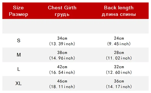 S: Длина спины: 24cm/9,45 '', грудь: 34cm/13,39''M: Длина спины: 28cm/11,02 '', грудь: 38cm/14,96''