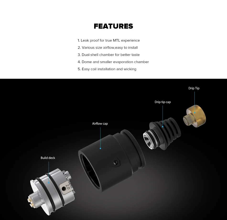 1. Leak proof for true MTL experience 2. Various size airflow,easy to install 3. Dual-shell chamber for better taste 4. Dome and smaller evaporation chamber 5. Easy coil installation and wicking