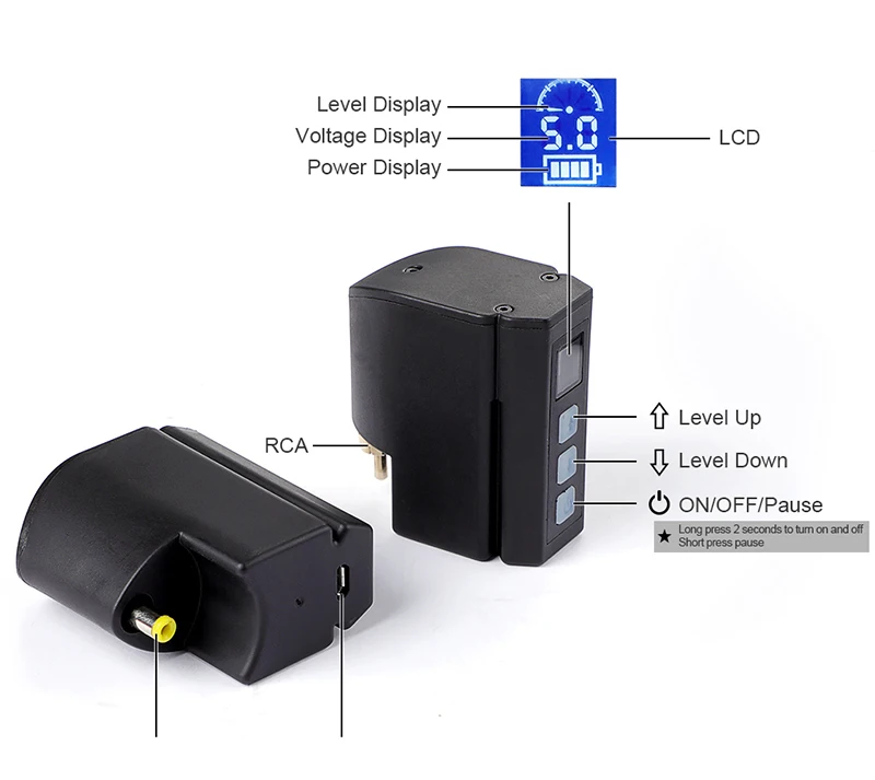 1. Эта машина питания татуировки обеспечивает 5 напряжений: 5 В, 6,5 в, 8 в, 9,5 в, 11 В. 2. Нажмите и удерживайте кнопку, чтобы включить/выключить, дважды нажмите, чтобы переключиться между этими напряжениями. LEVAL вверх и уровень вниз 3. Позволяет ротационным машинам татуировки и ручкам татуировки работать без зажимов шнуров. 4. Разделен на интерфейс постоянного тока и RCA Интерфейс для вашего выбора. 5. Доступно для перманентного макияжа оборудование татуировки ручка машина. 6. Хороший дизайн, маленький размер, светильник вес и легко носить с собой. Так что вы можете осуществить наружную татуировку. 7. Для зарядки этого источника питания можно использовать обычное зарядное устройство USB для телефона.