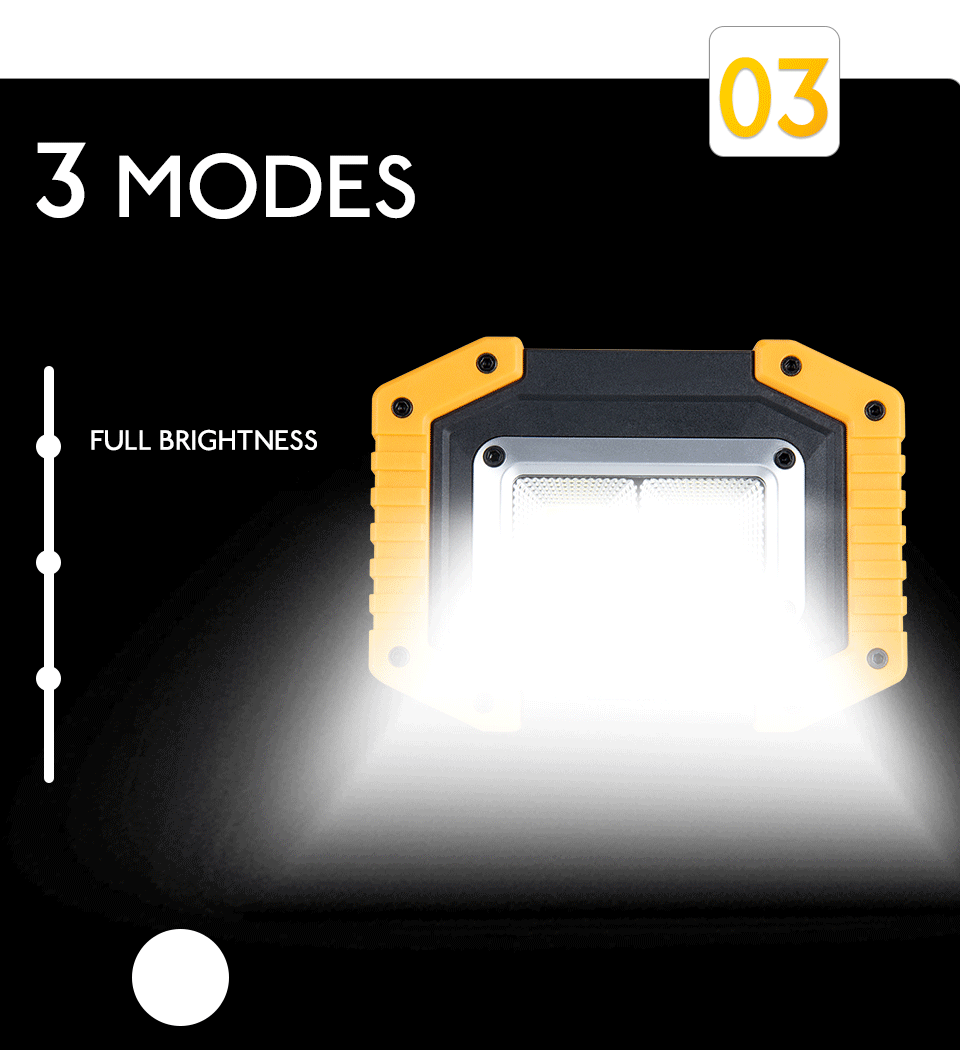 Спецификация: Тип лампы: COB светодиодный Питание: 2*18650 батареи или 4 * AA батареи могут использовать 2*18650 перезаряжаемые батареи, вы также можете использовать четыре AA батареи Размер продукта: около 135*95 мм Материалы изделия: АБС-пластик Режим работы: высокий-низкий-выключение вспышки Мощность: 30 Вт Срок Светодиодный да: 100000 часов Яркость: 1200 люмен Время зарядки: около 4-6 часов Время работы: около 8 - 12 часов Цвет: черный и желтый Особенности: Простая Кнопка включения/выключения на задней стороне Зарядка через USB USB-выход для зарядки мобильного устройства Короткое нажатие кнопки переключения для зарядки мобильного устройства через USB-соединение. Три режима освещения на ваш выбор. Индикатор будет гореть, когда светильник работает или заряжается мобильный телефон Упаковочный лист: USB-кабель для зарядки * 1 Рабочий свет * 1 (батарея в комплект не входит)