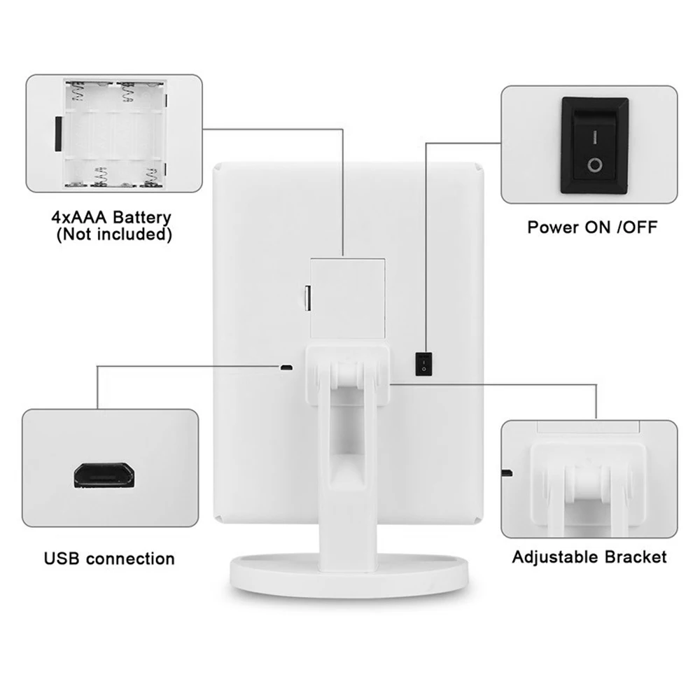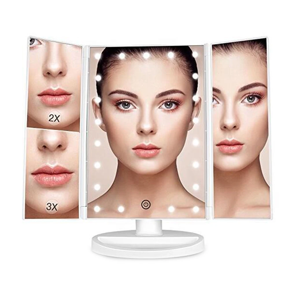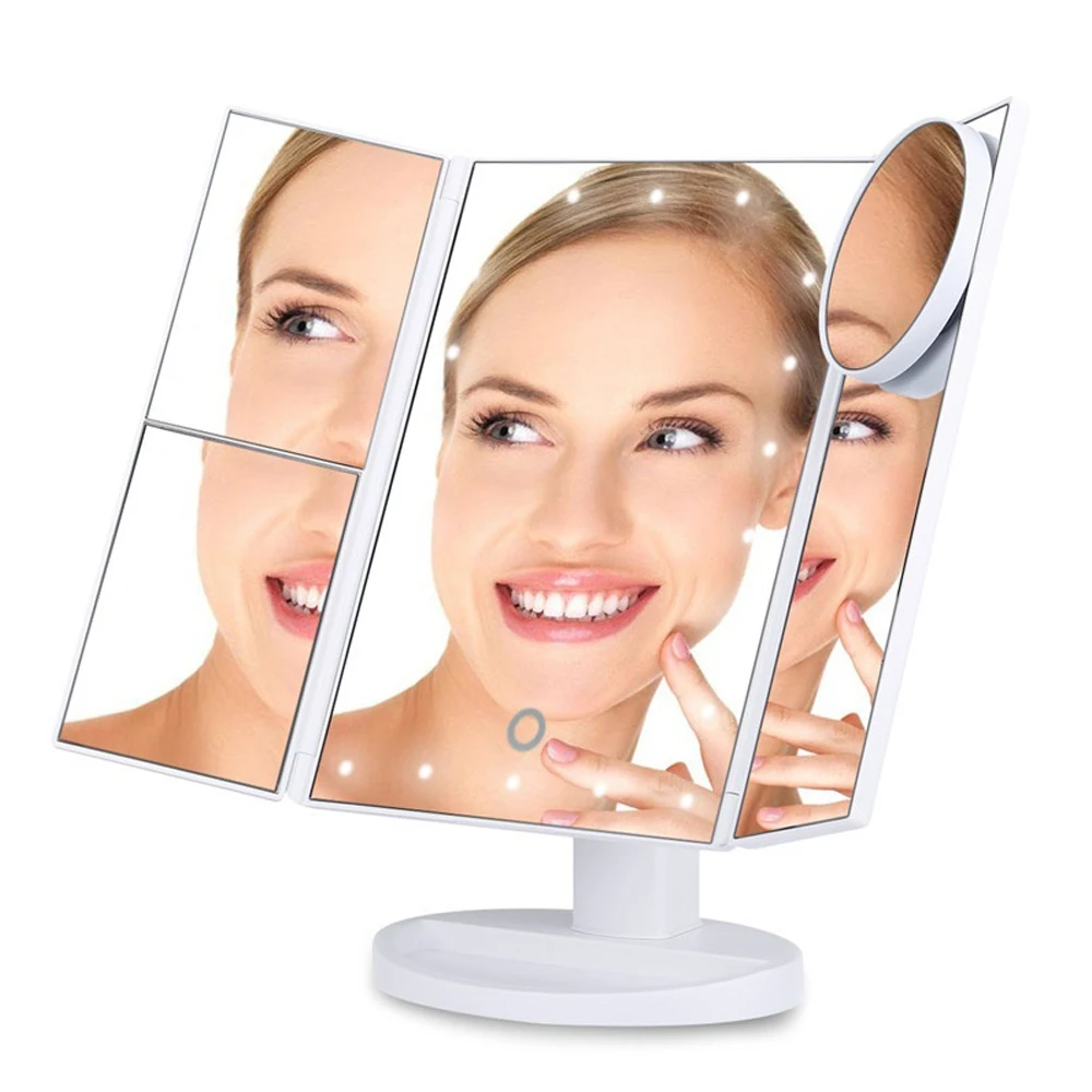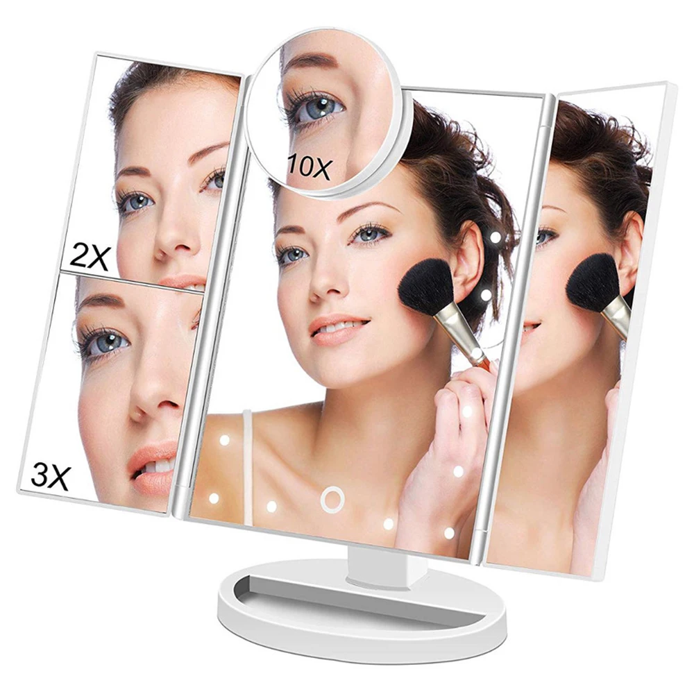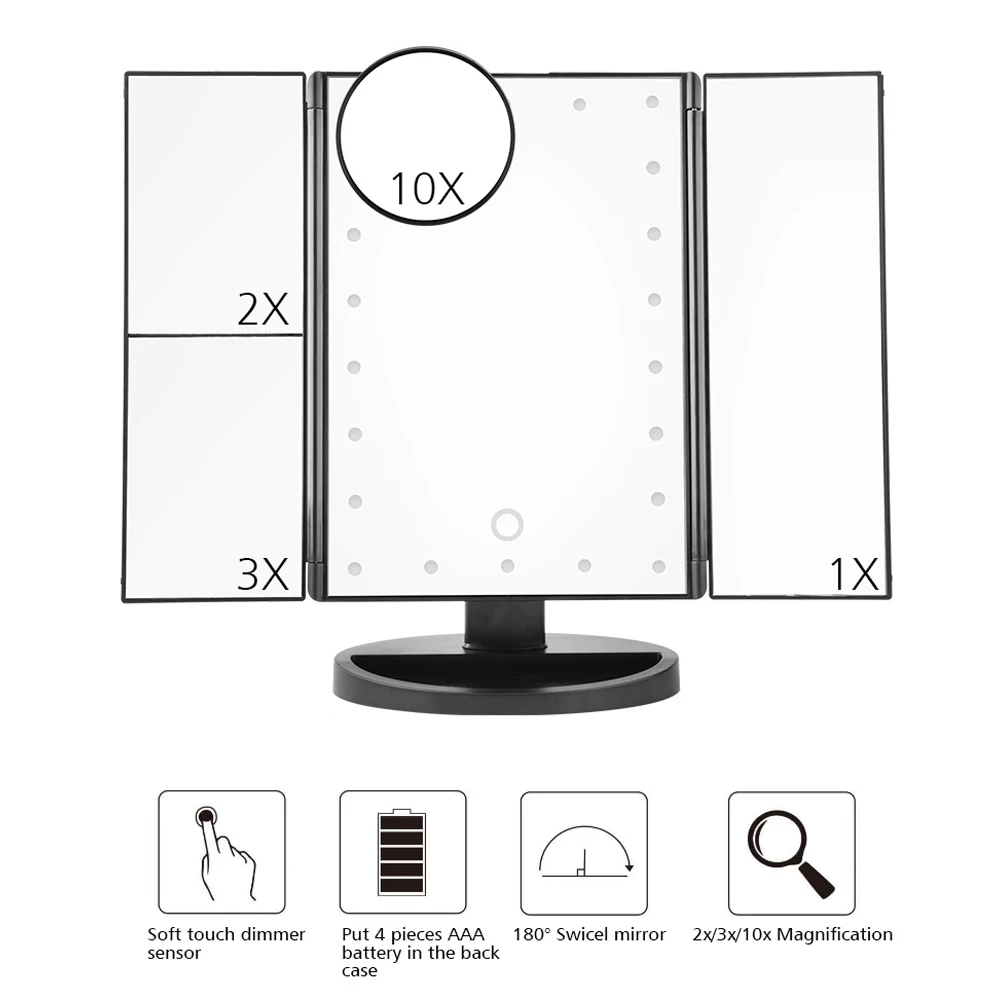 4 панели: 1 плоское зеркало с 2X 3-кратным увеличением дает вам идеальный панорамный вид. Поставляется с бонусным увеличительным пятном 10X, что позволяет вам четко видеть ваши черты лица и показать увеличенные детали ухода за вашим макияжем идеально.