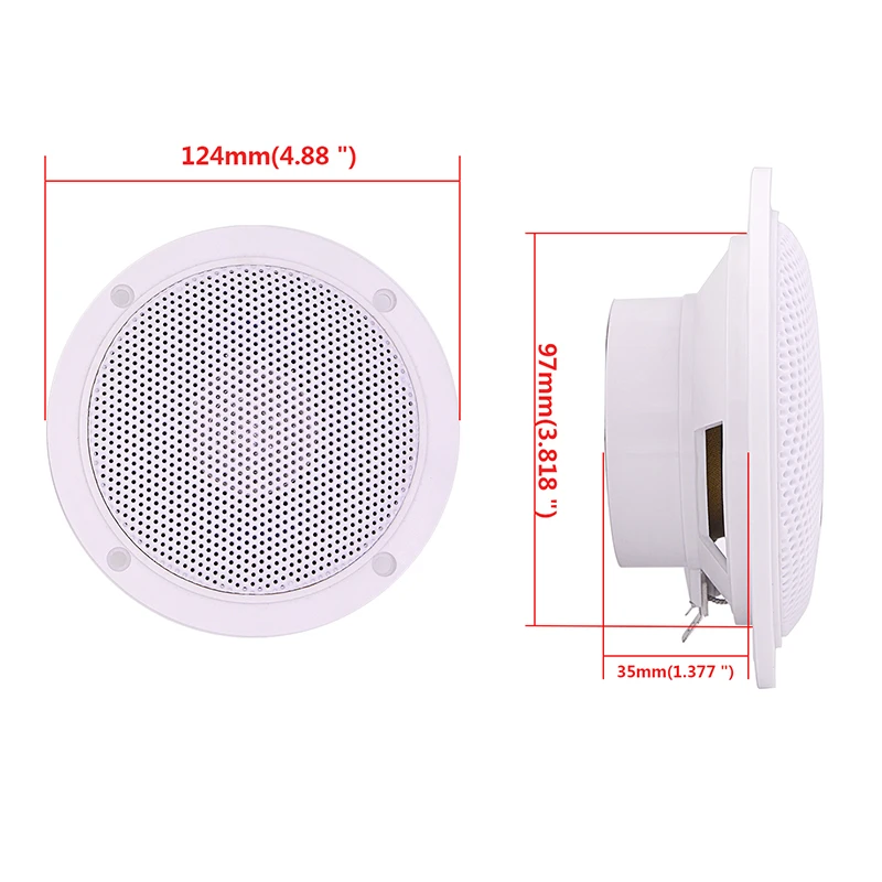4-дюймовые Морские водонепроницаемые Динамики 120 ВтХарактеристики:Цвет: белыйВодонепроницаемость: IP66Размер конуса: 4"Диаметр монтажного отверстия: 115 мм (4,52 ")Монтажная глубина: 35 мм/(1,37 ")Сопротивление: 4 ОмЧастотная характеристика: 120 Гц-20 кГцМощность (макс.): 60 ВтМатериал гриля: УФ-пластикМатериал корзины: УФ-пластикМатериал конуса: полипропиленРезиновая окантовка: ДаМатериал магнита: Феррит, 4 унцииЗащита магнита: пластиковая водозащитнаяSPL(1 Ватт/1 метр): 89 дБИдеально подходит для:Автомобили, мотоциклы, яхты, рыболовные лодки, каюты, лыжные лодки, устройство также идеально подходит для спа бассейнов, квадроциклов, тележек для гольфа, UTV,ATV и RV