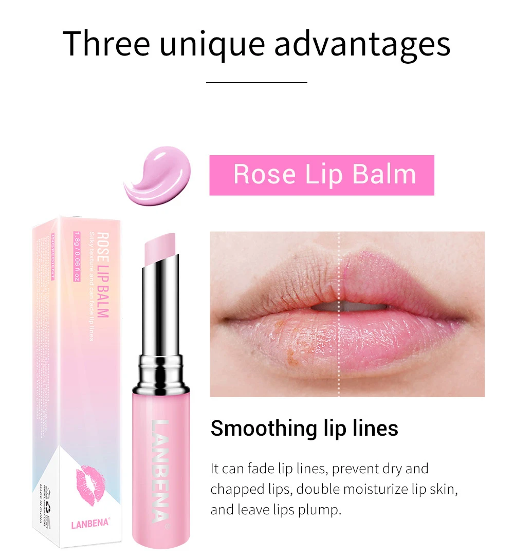 Три уникальные преимущества Розовый бальзам для губ Сглаживания, стирает линию губ Он может выцветать линии губ, предотвратить сухие и обветренные губы, дважды увлажнить кожу губ и оставить губы пухлые.