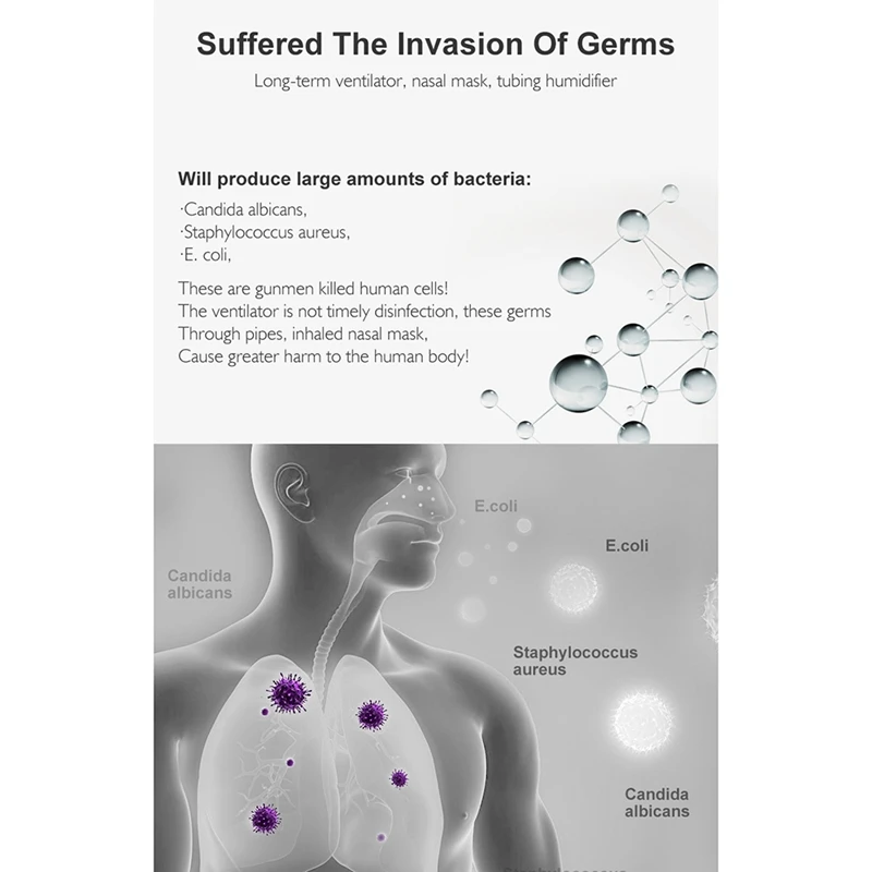Очиститель CPAP автоматически очищает ваш CPAP или двухуровневый аппарат с помощью озона, также известного как активированный кислород, всего за 30 минут. Просто Подключите аппарат CPAP или BiLevel к стерилизатору, включите его и уйдите. В течение 30 минут дезинфицирующее средство убивает 99% таких патогенов, как плесень, бактерии и вирусы, которые растут в маске CPAP, шланге и камере для воды.
