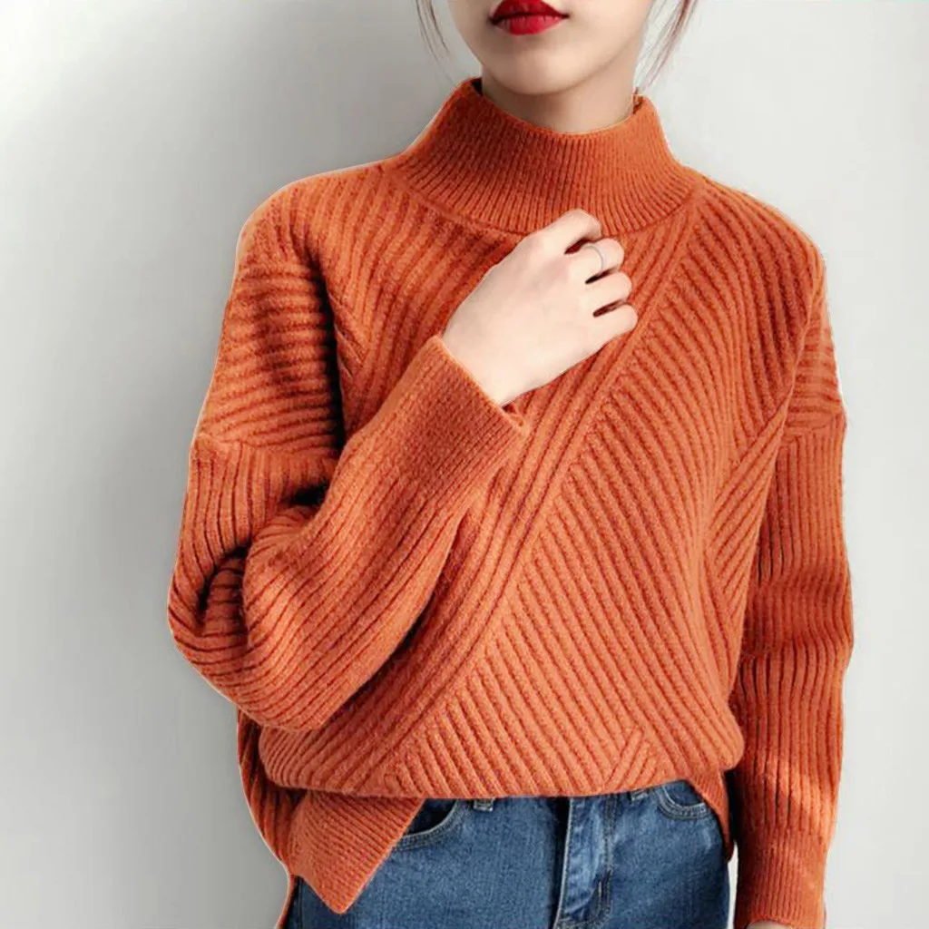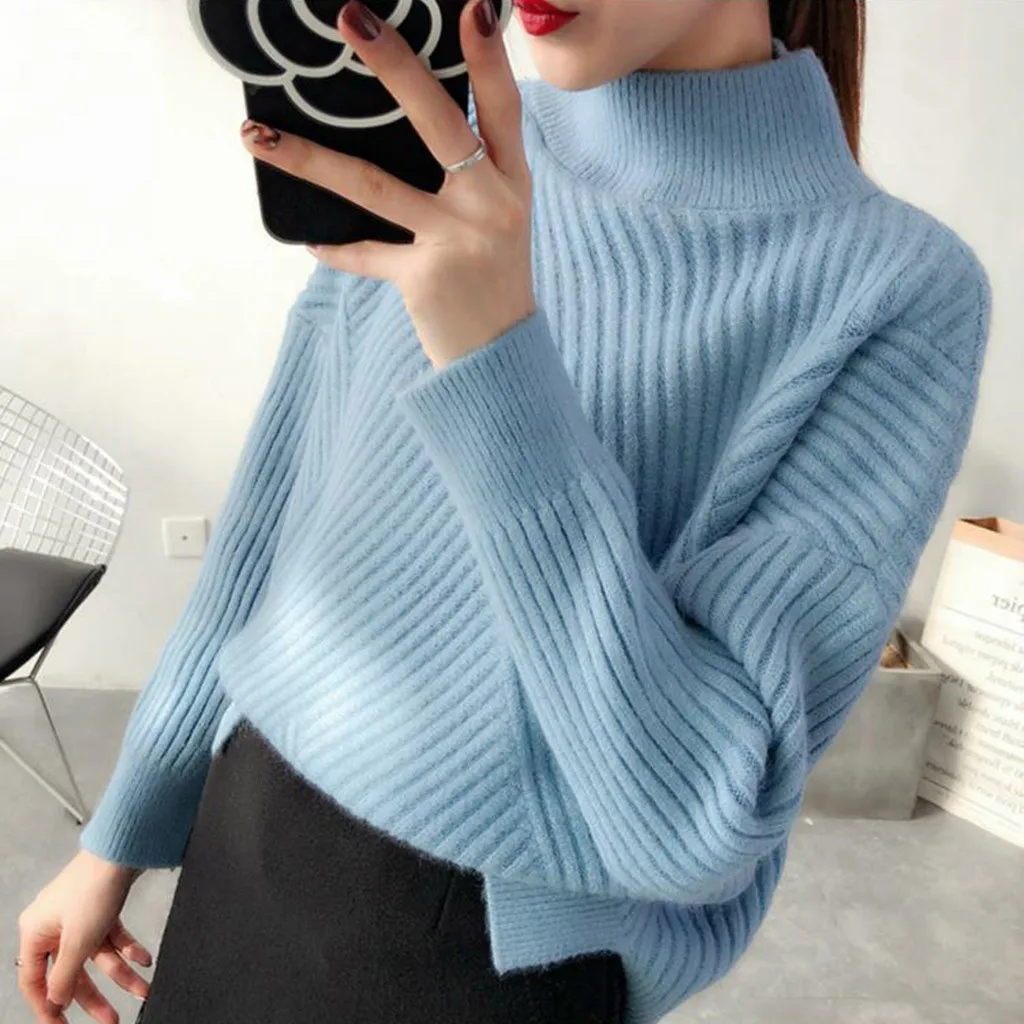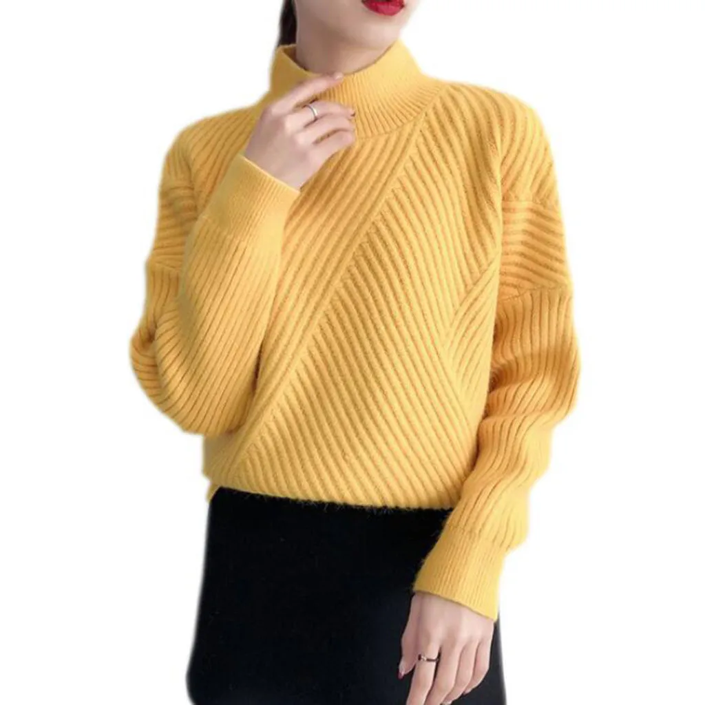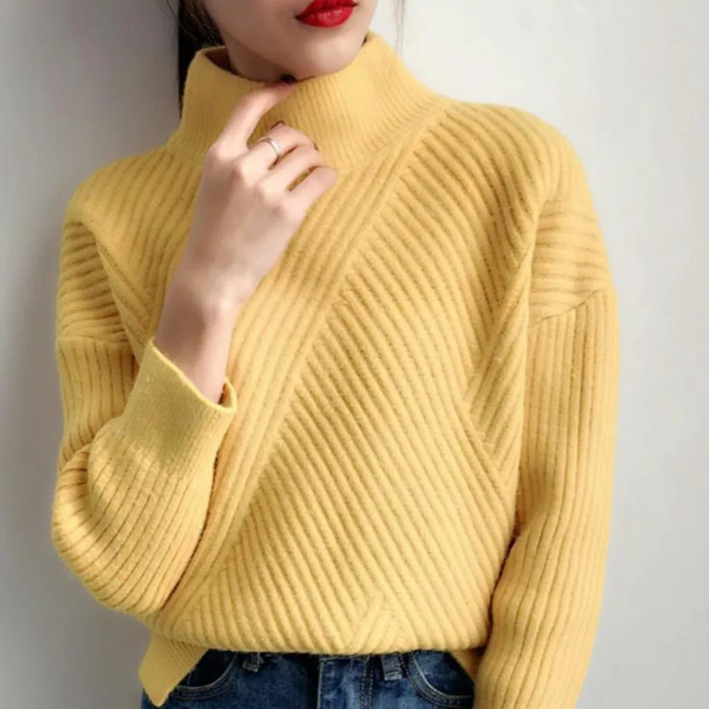 Осенне-зимний Повседневный свитер для женщин, однотонный пуловер с высоким воротником, вязаные базовые Топы