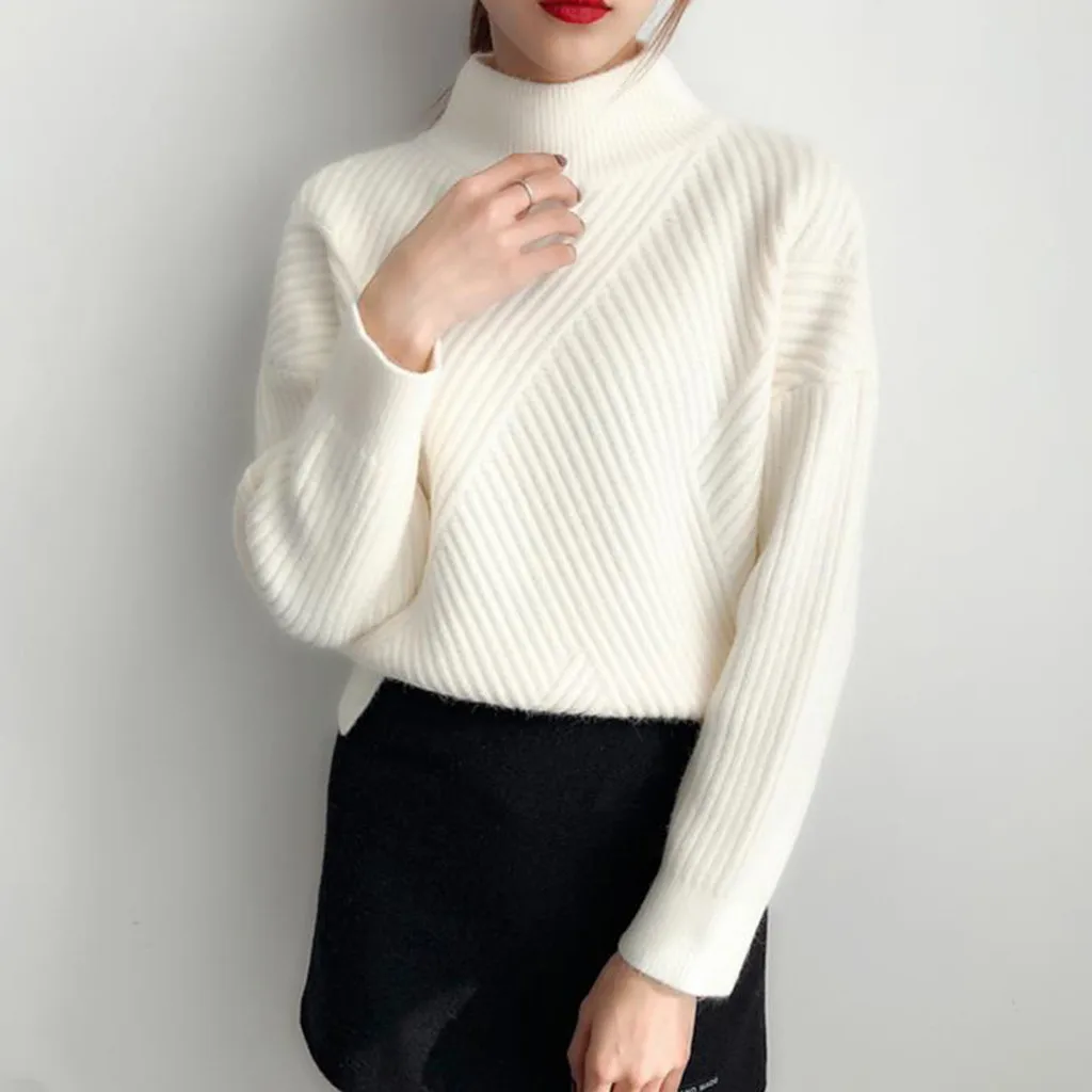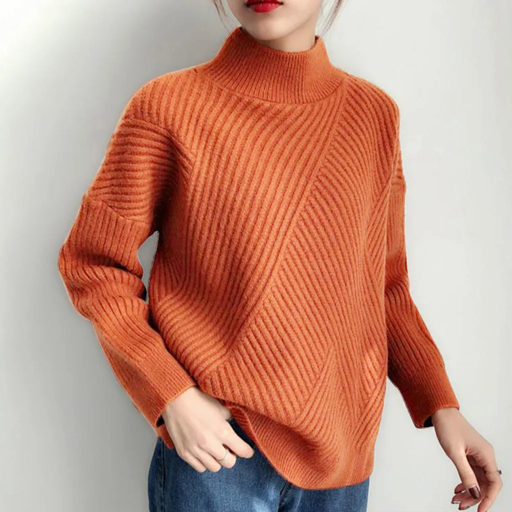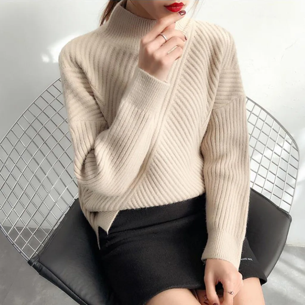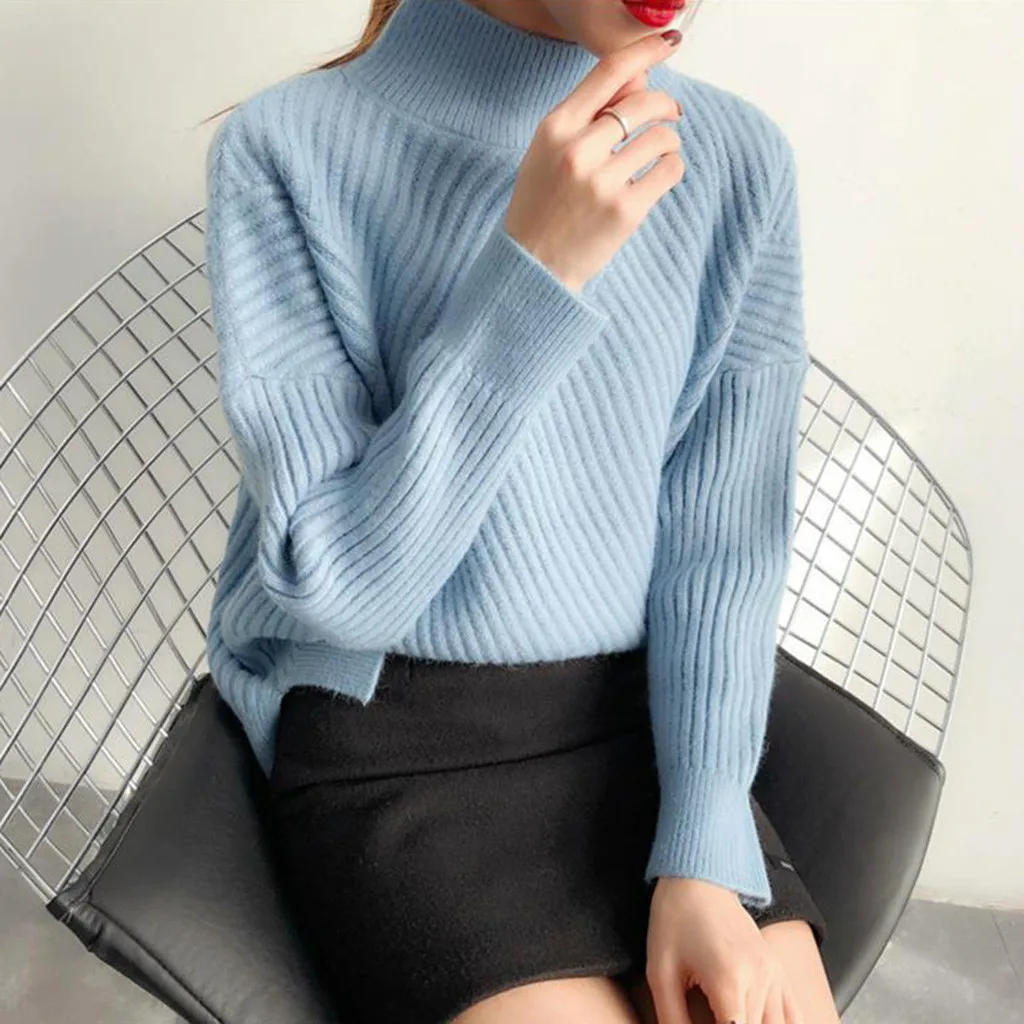 Осенне-зимний Повседневный свитер для женщин, однотонный пуловер с высоким воротником, вязаные базовые Топы