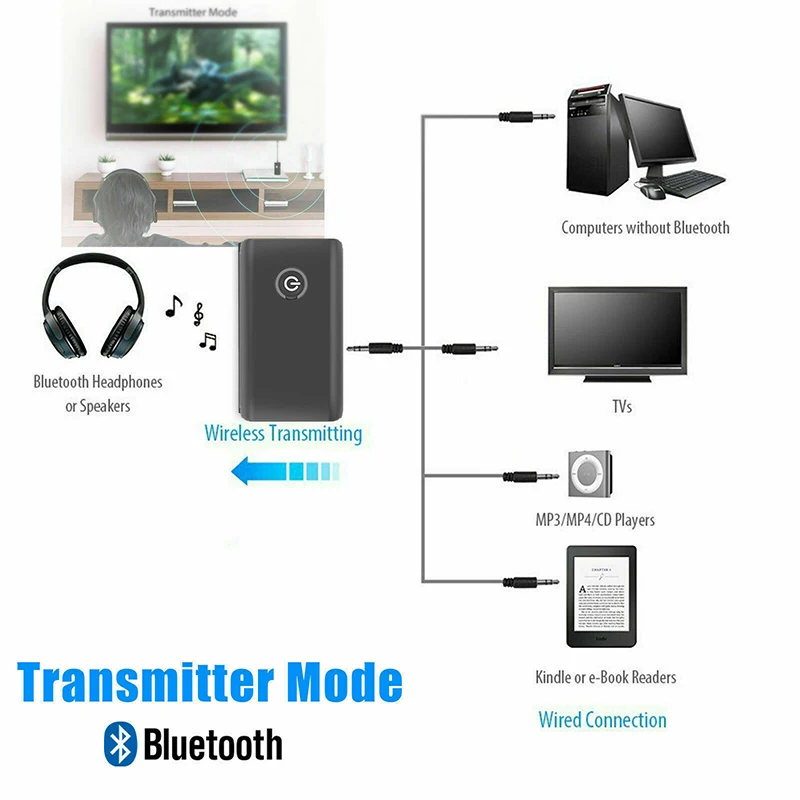 * Передатчик Bluetooth: Добавьте беспроводные возможности Bluetooth к телевизору, ПК, mp3-плееру, dvd-плееру и наслаждайтесь беспроводной музыкой и звуком.
