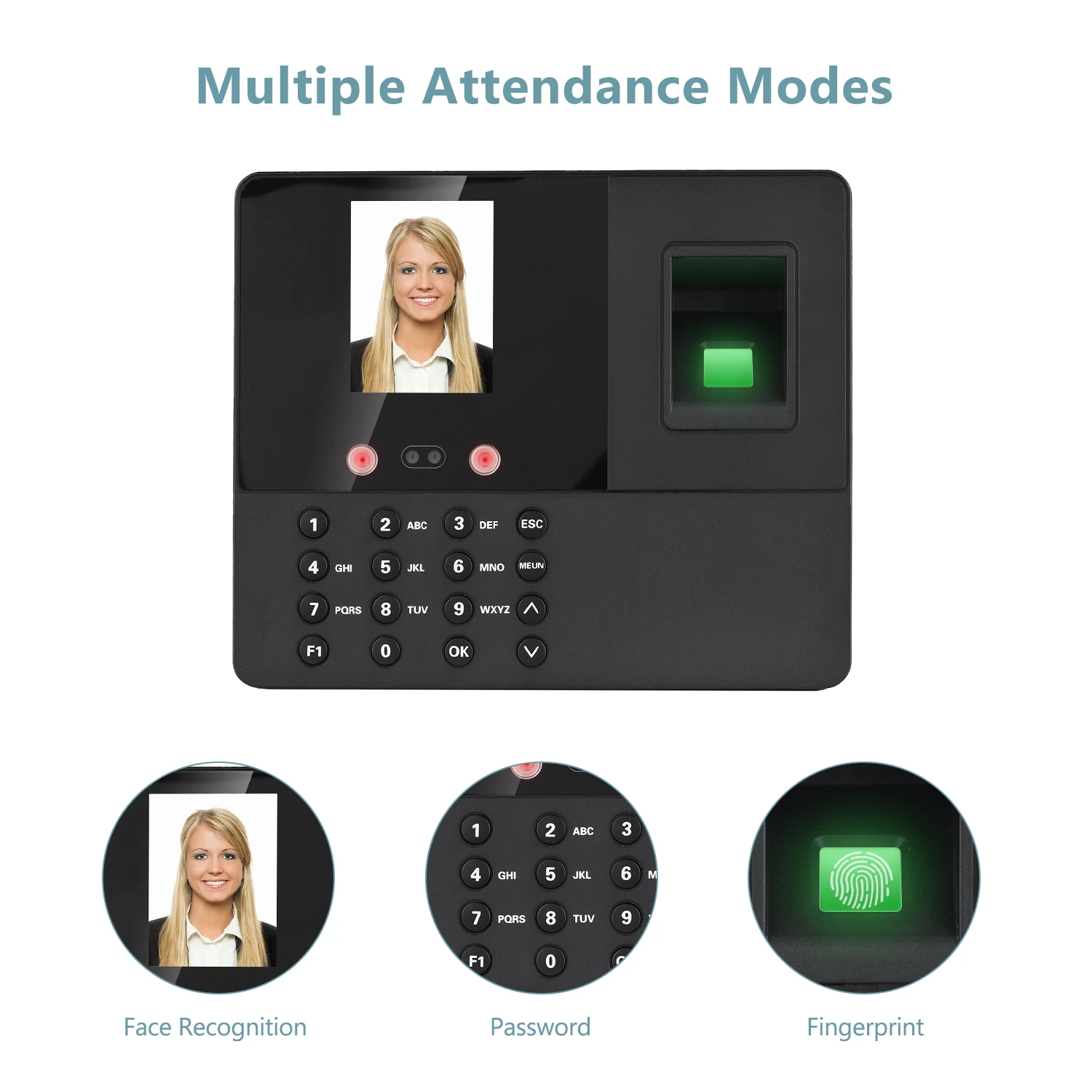 Высокая емкость и 3 режима посещаемости: Поддержка режима проверки подлинности лица, отпечатков пальцев и паролей, 300 лиц, 3000 отпечатков пальцев и 160000 записей.